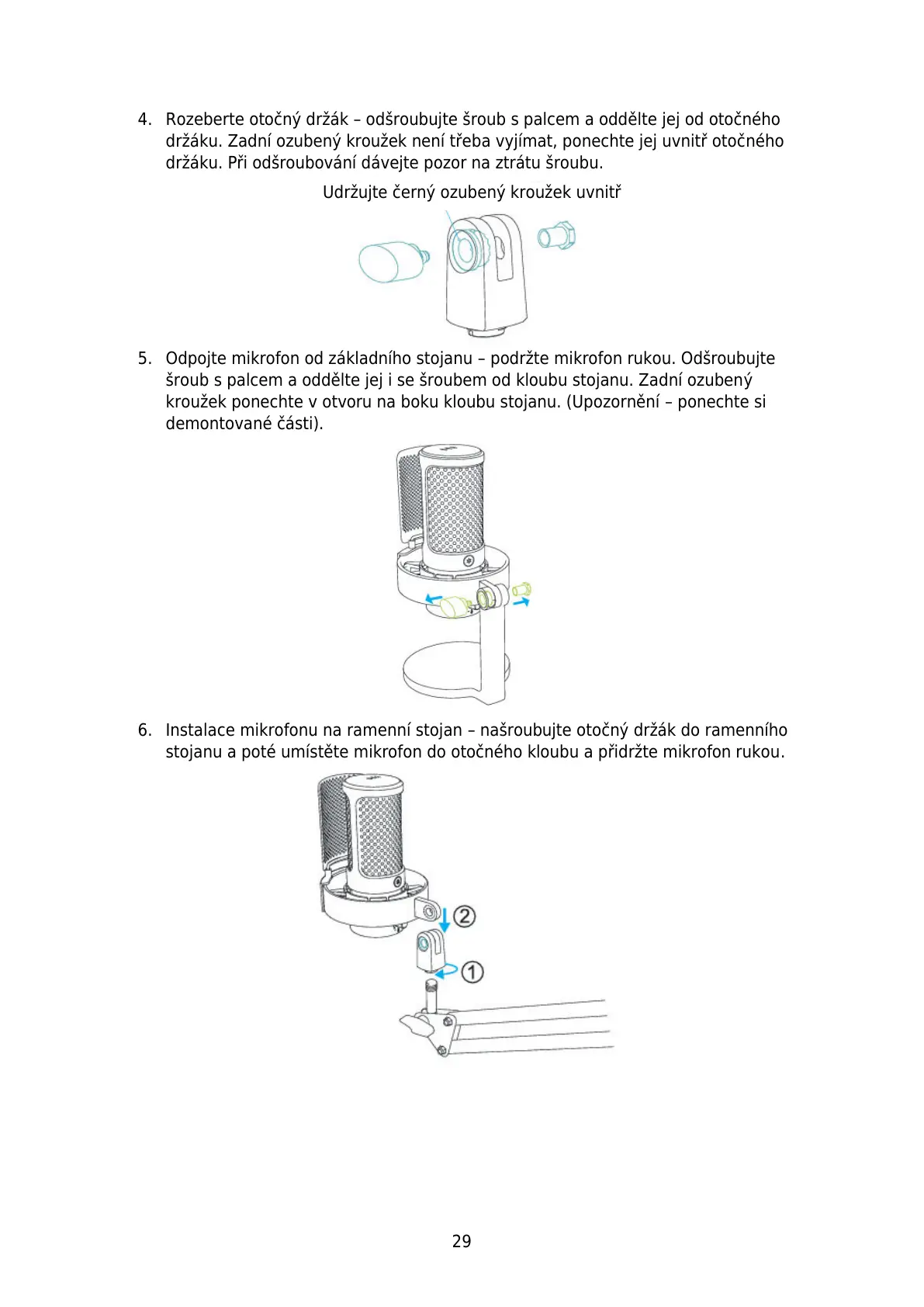 6. Instalace mikrofonu na ramenní stojan – našroubujte otočný držák do ramenního