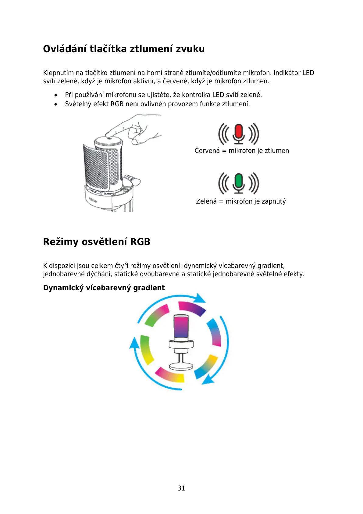 svítí zeleně, když je mikrofon aktivní, a červeně, když je mikrofon ztlumen.
