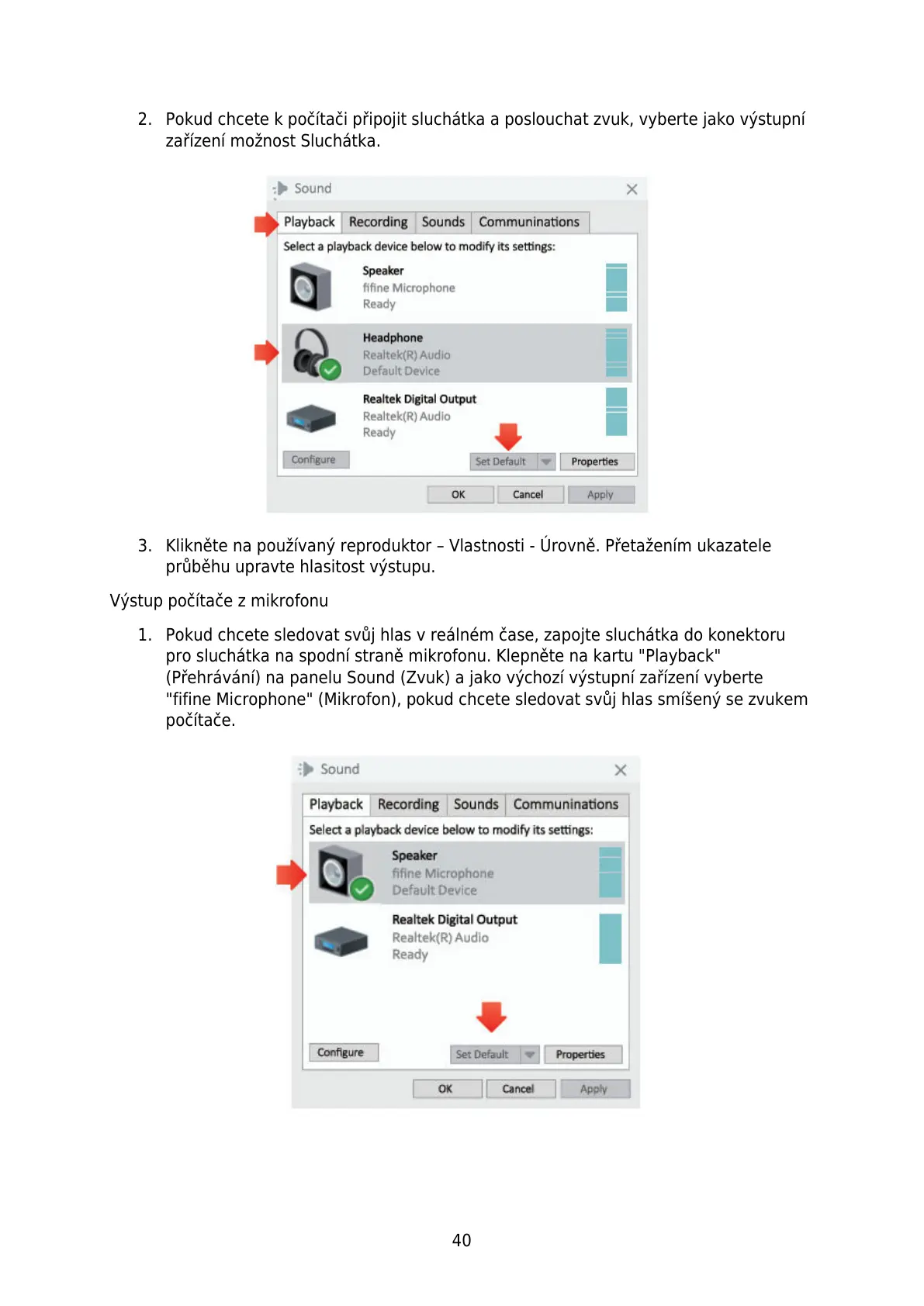(Přehrávání) na panelu Sound (Zvuk) a jako výchozí výstupní zařízení vyberte