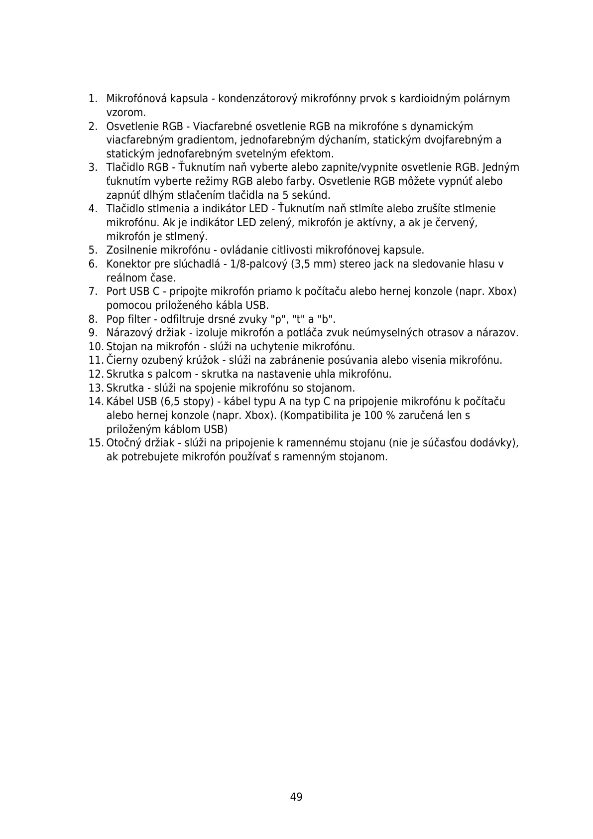 14. Kábel USB (6,5 stopy) - kábel typu A na typ C na pripojenie mikrofónu k počítaču