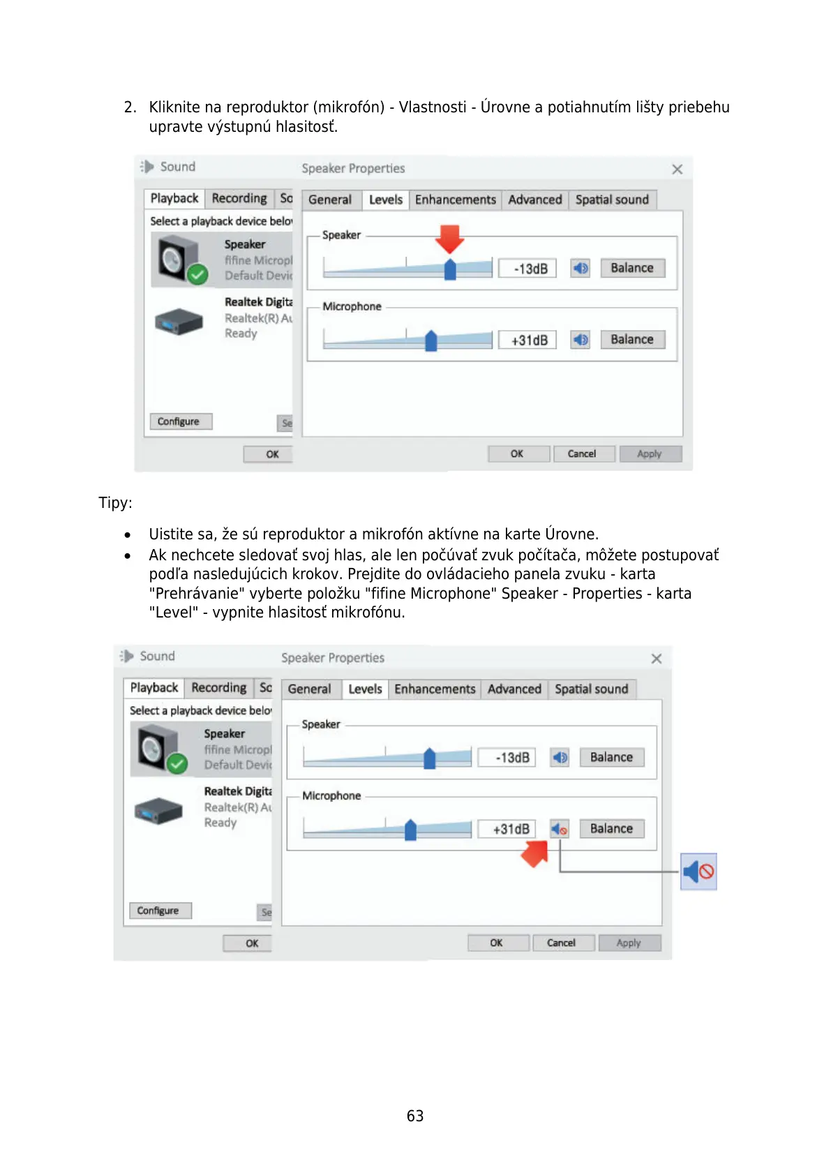 2. Kliknite na reproduktor (mikrofón) - Vlastnosti - Úrovne a potiahnutím lišty priebehu