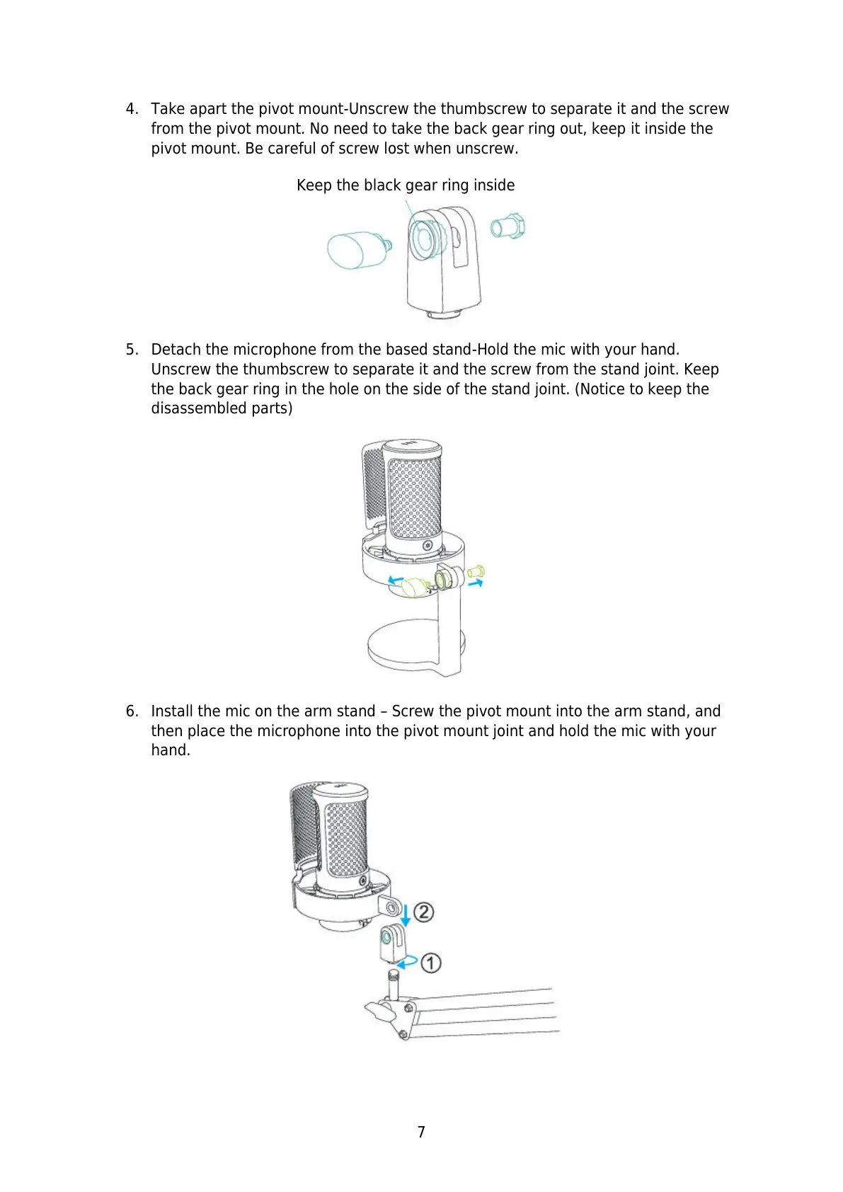 6. Install the mic on the arm stand – Screw the pivot mount into the arm stand, and
