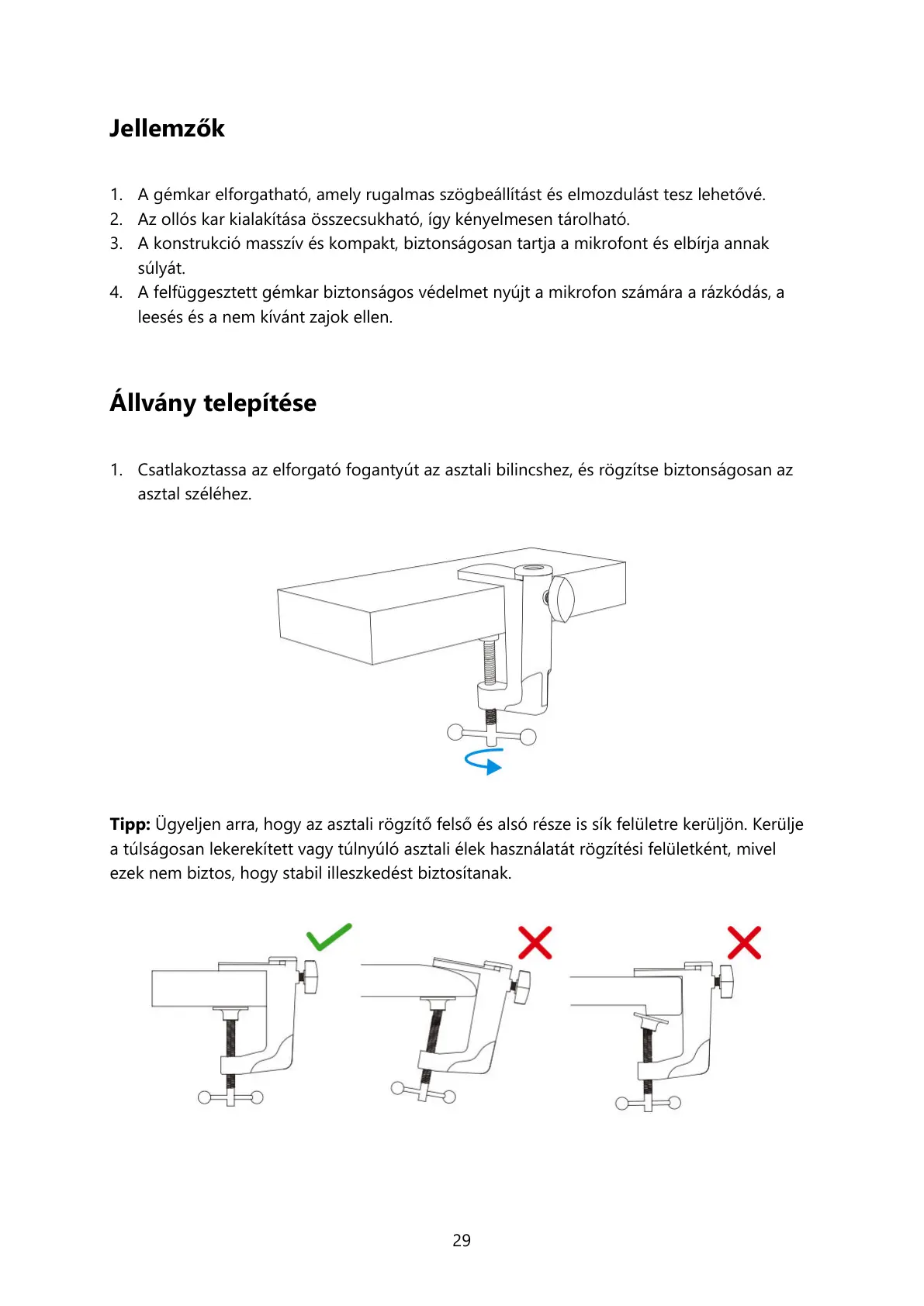 Tipp: Ügyeljen arra, hogy az asztali rögzítő felső és alsó része is sík felületre kerüljön. Kerülje