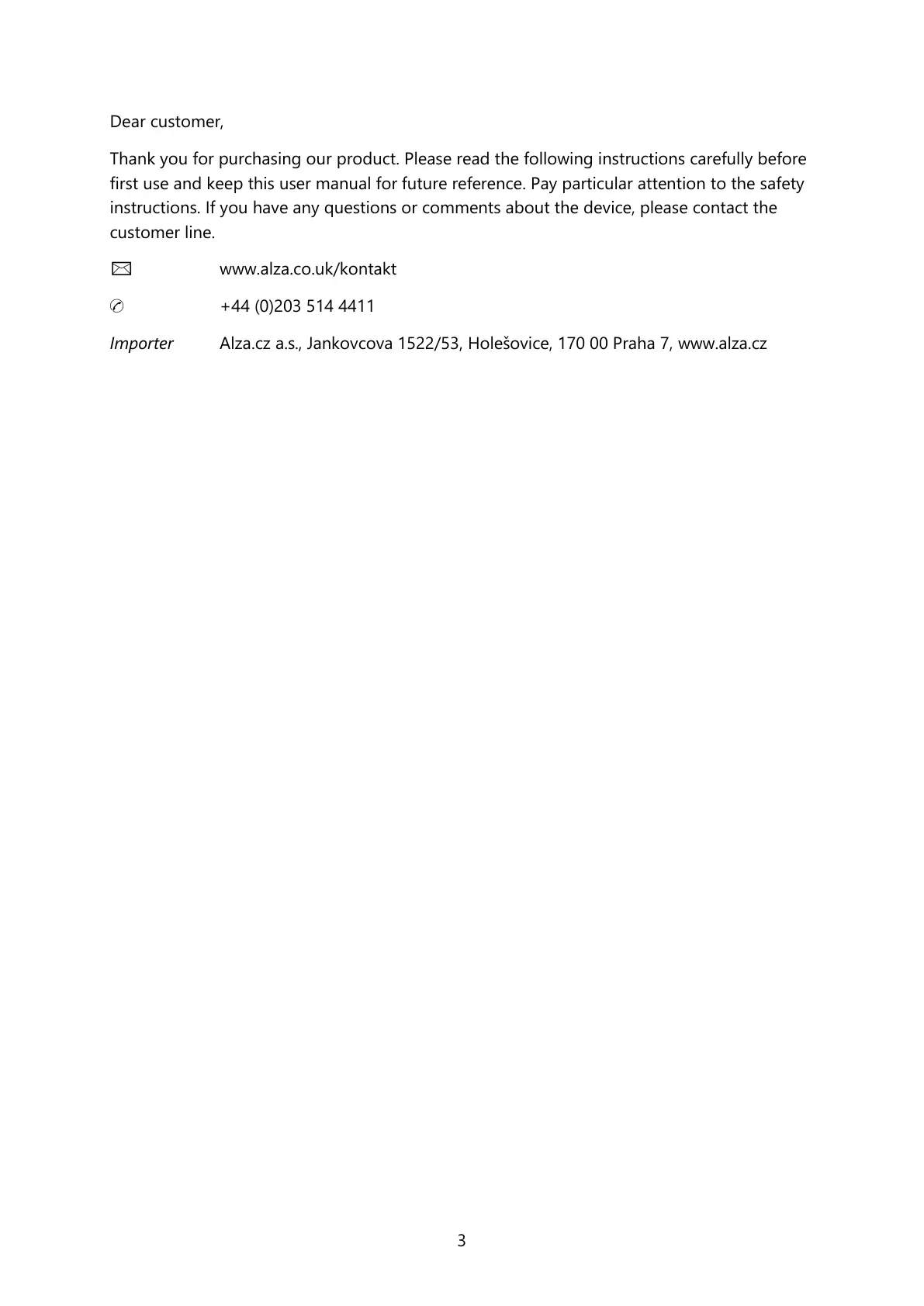 Importer Alza.cz a.s., Jankovcova 1522/53, Holešovice, 170 00 Praha 7, www.alza.cz