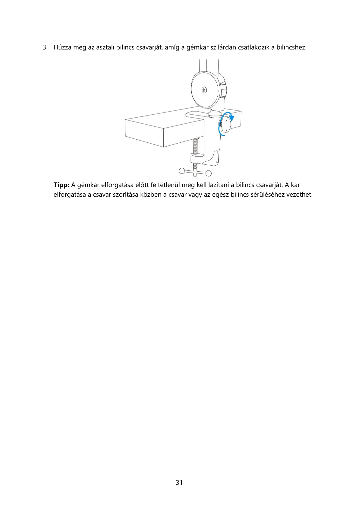 3. Húzza meg az asztali bilincs csavarját, amíg a gémkar szilárdan csatlakozik a bilincshez.