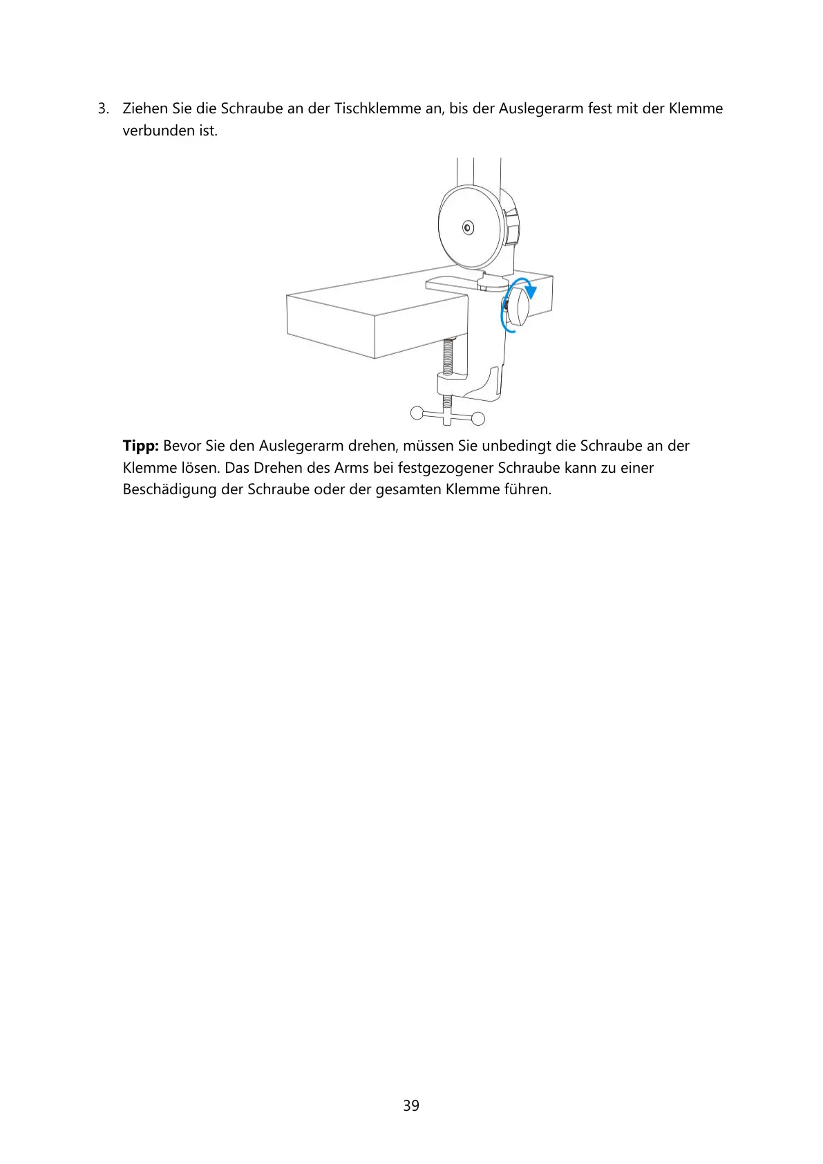 Tipp: Bevor Sie den Auslegerarm drehen, ssen Sie unbedingt die Schraube an der