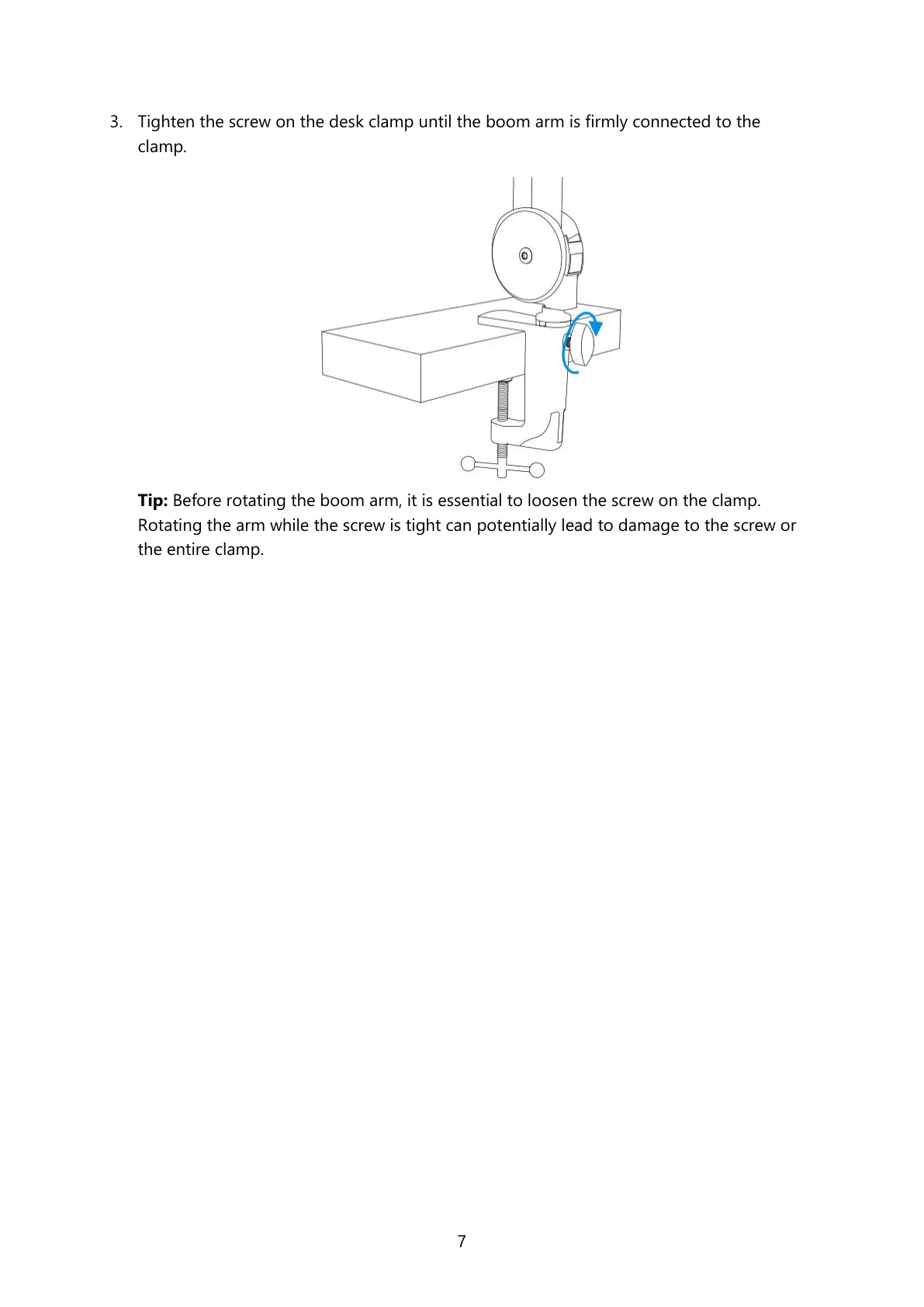Tip: Before rotating the boom arm, it is essential to loosen the screw on the clamp.