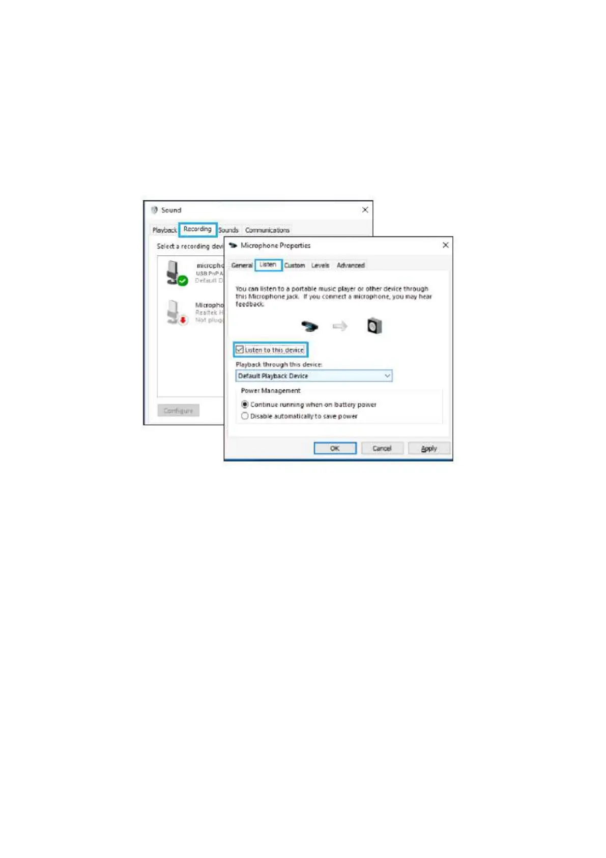 "Properties"-"Listen'"-re, kattintson a "Listen to this device"-"Apply". Nem hallható hang
