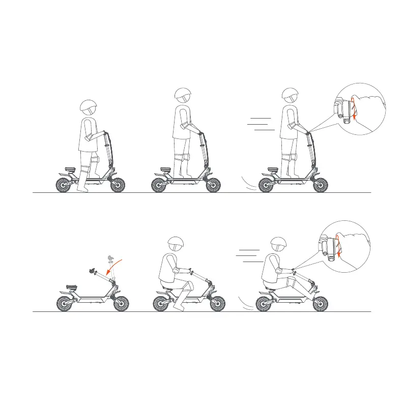 ① E-Scooter mode:Stand on the deck with one foot, push back on the ground with the other foot,