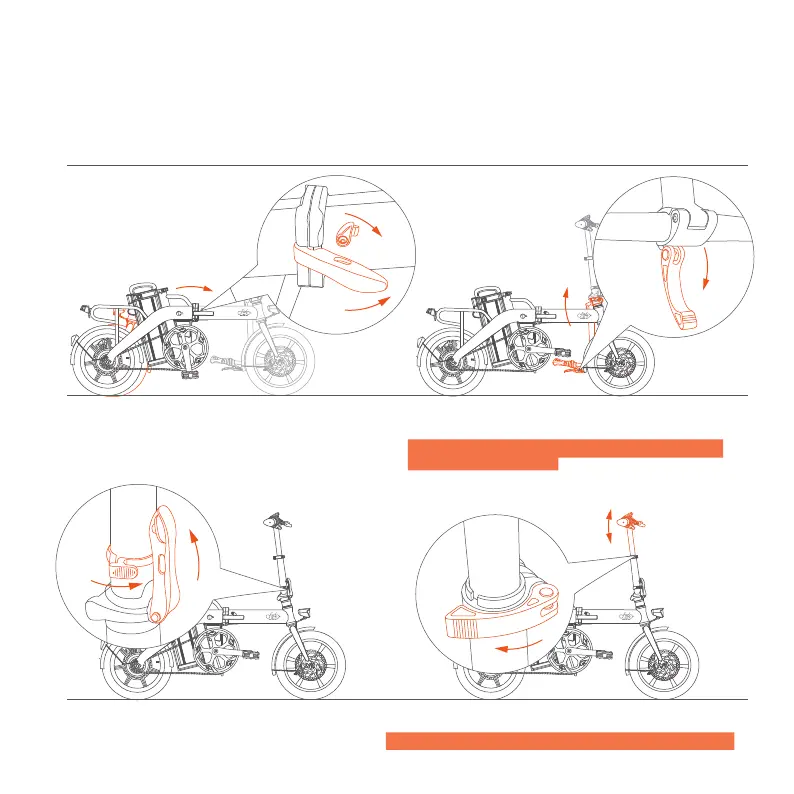 ① Unfolding the bike, close the frame clamp and lock it. ② 2.Open the quick release, adjust the handlebar to the right