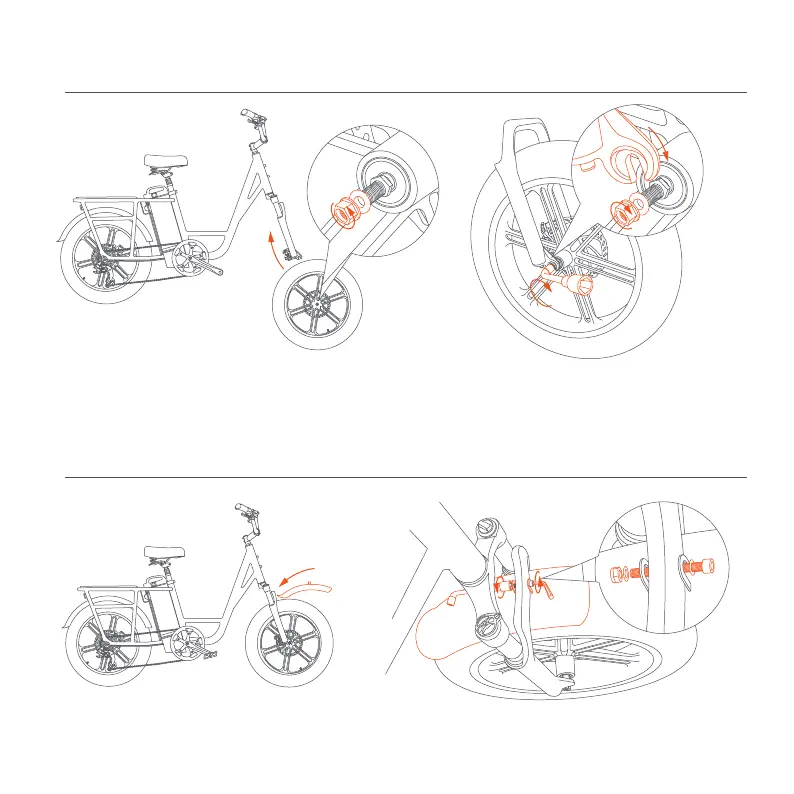 Put the front fender through the gap of the tire and fork, then screw tightenly.