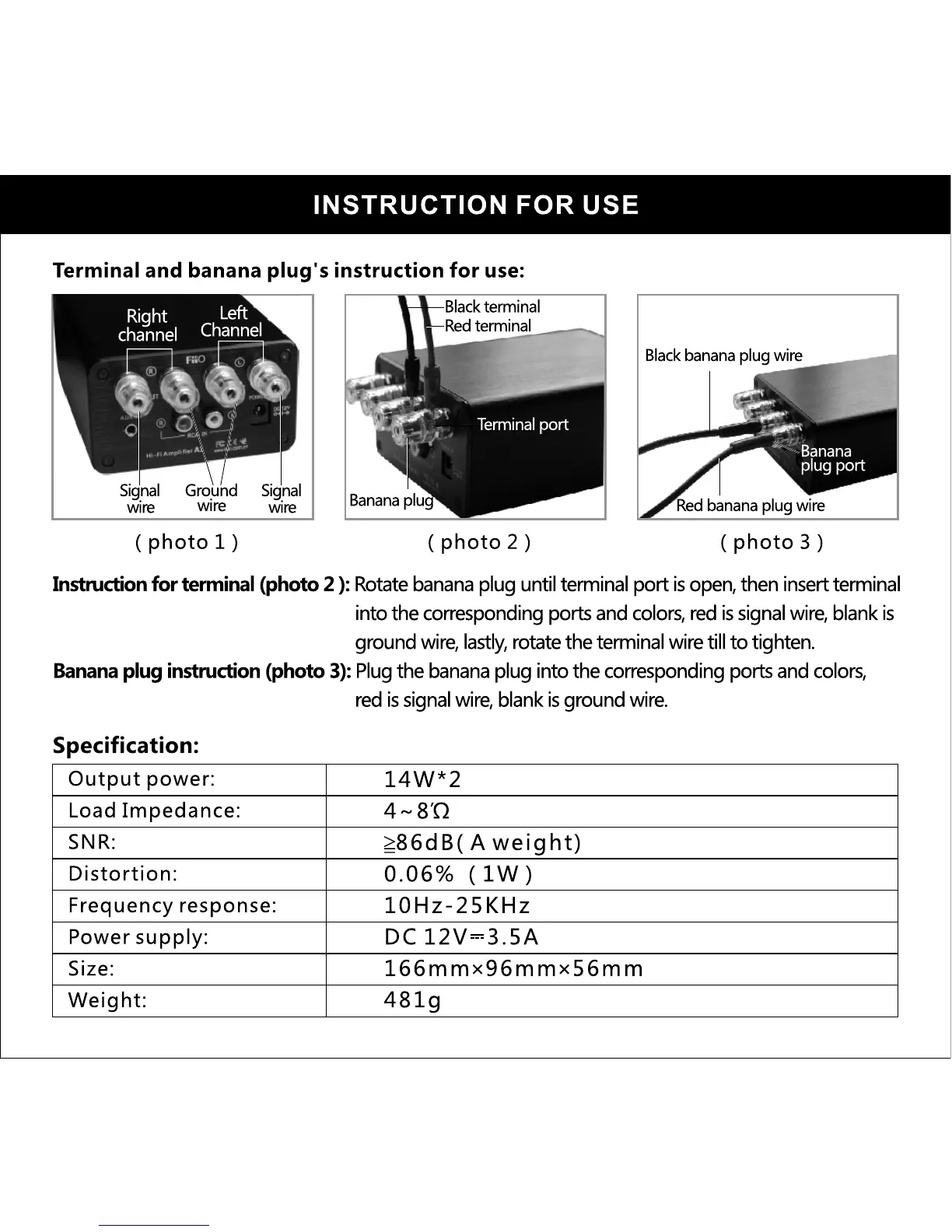 Fiio A1 - Instruction for Use; Terminal and Banana Plug Instructions; Product Specifications