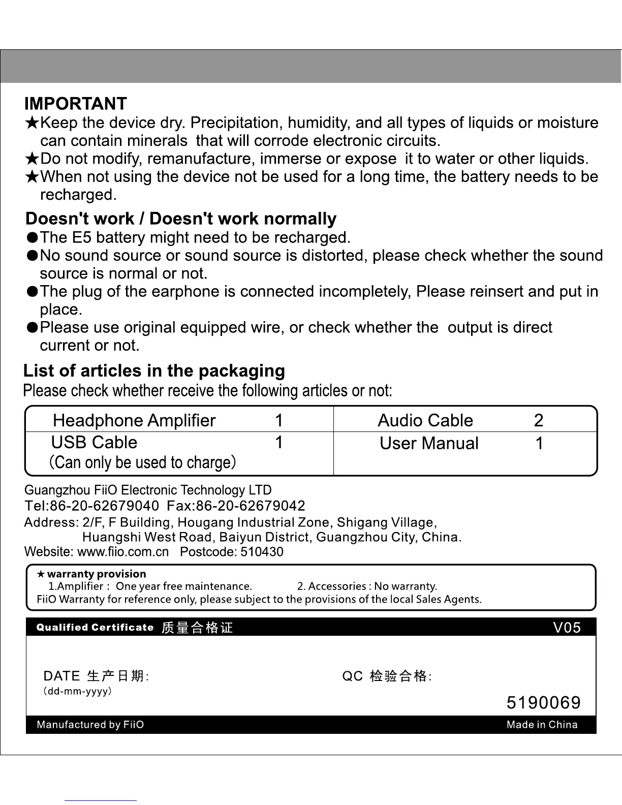 Fiio E5 - Important Information and Troubleshooting; Safety and Handling Precautions; Troubleshooting Common Issues; Package Contents and Certification