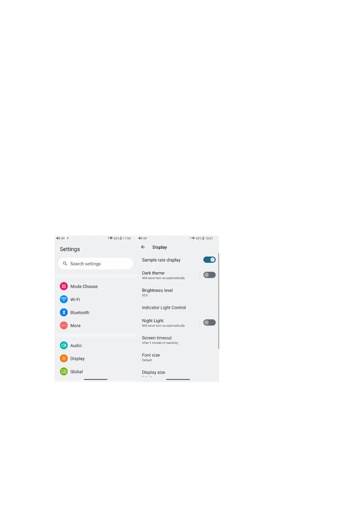 Brightness level,Indicator light control, Night light, Screen timeout,