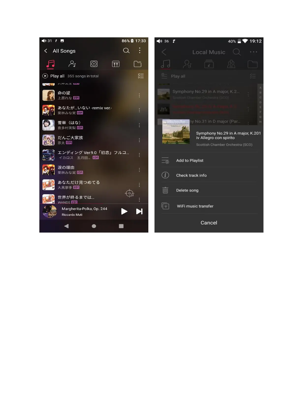 Bulk management: Play music, WiFi music transfer, Add to my favorites, Add to