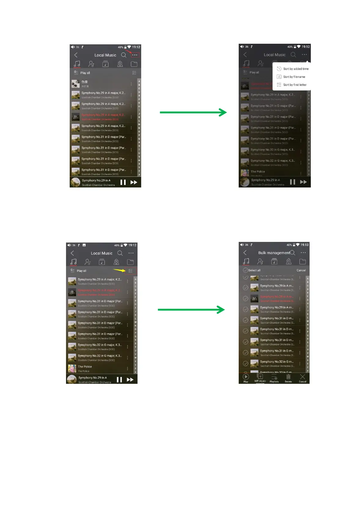 transfer music), batched add to Playlists, batched Delete, exit batch operation.