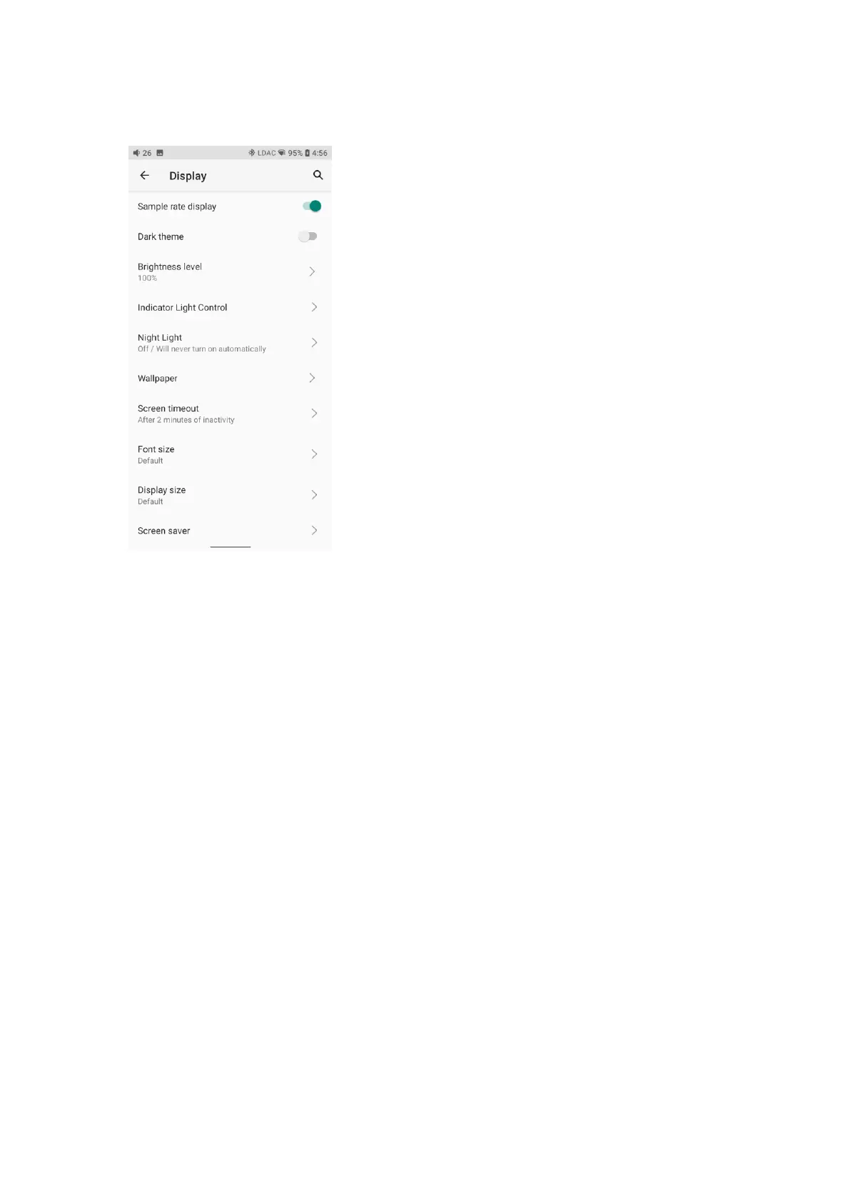 The display settings consist of Sample rate display, Dark theme, Brightness