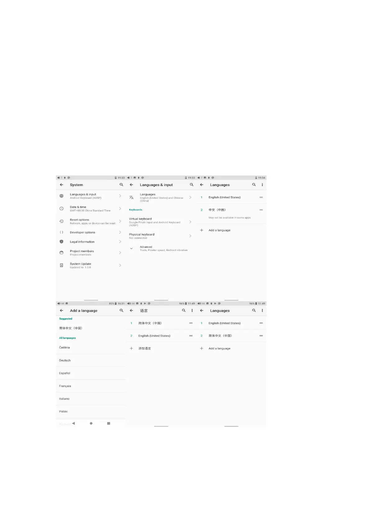 1) Go to the menu of Settings-> System-> Languages & input-> Languages;