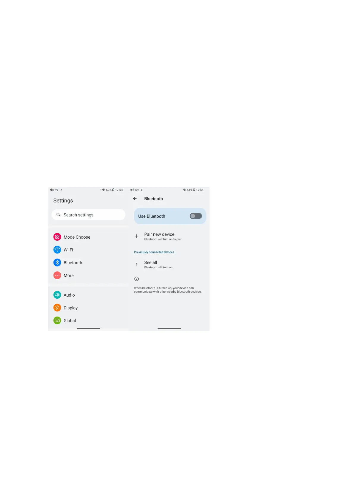 1. Go to the Settings->Bluetooth menu to turn on the Bluetooth function.