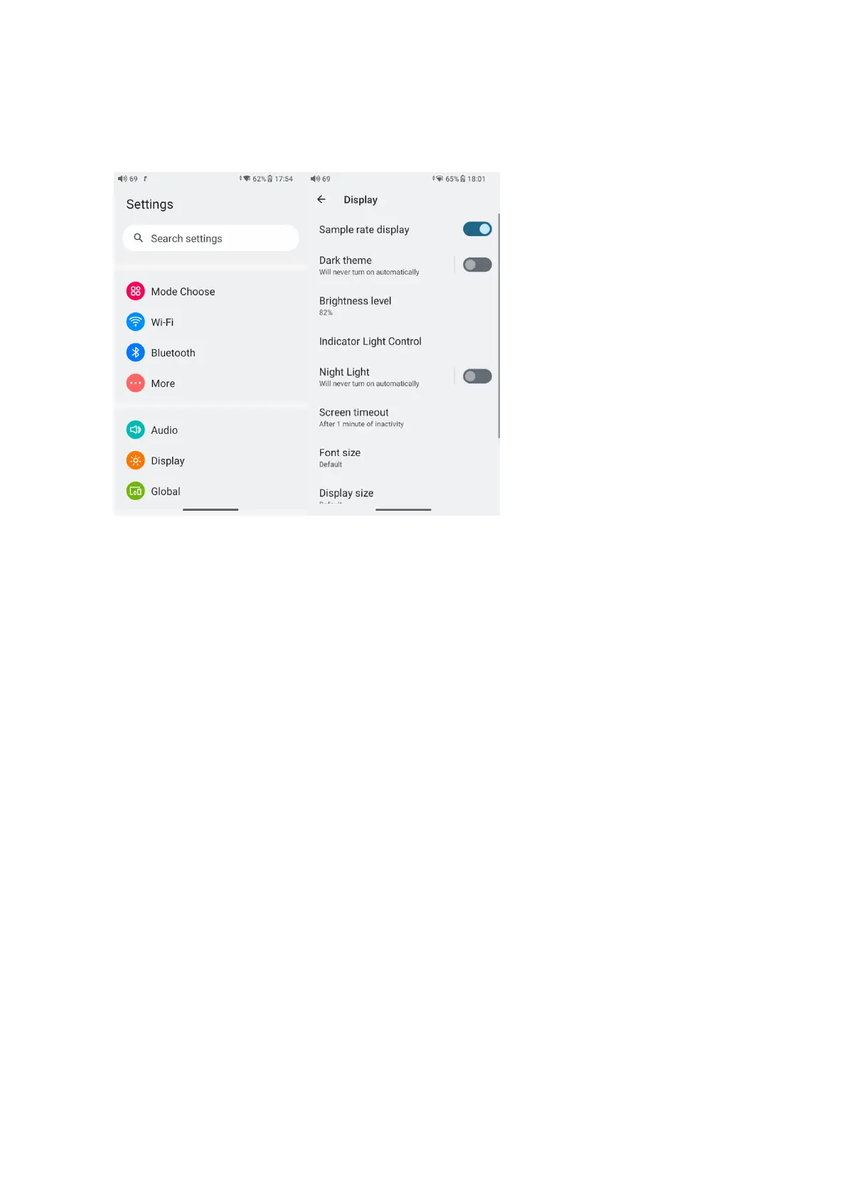 level,Indicator light control, Night light, Screen timeout, Font size, Display size,