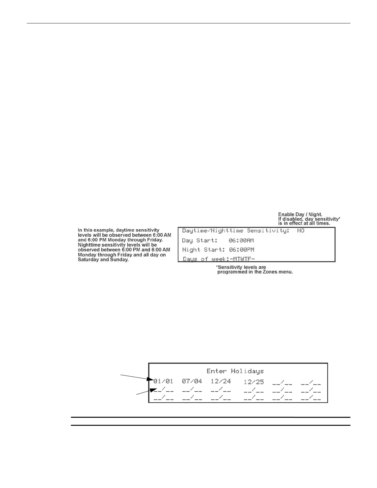 System will use night sensitivity for the entire day on days designated as holidays (see Section “Daytime/Nighttime Sensitiv-