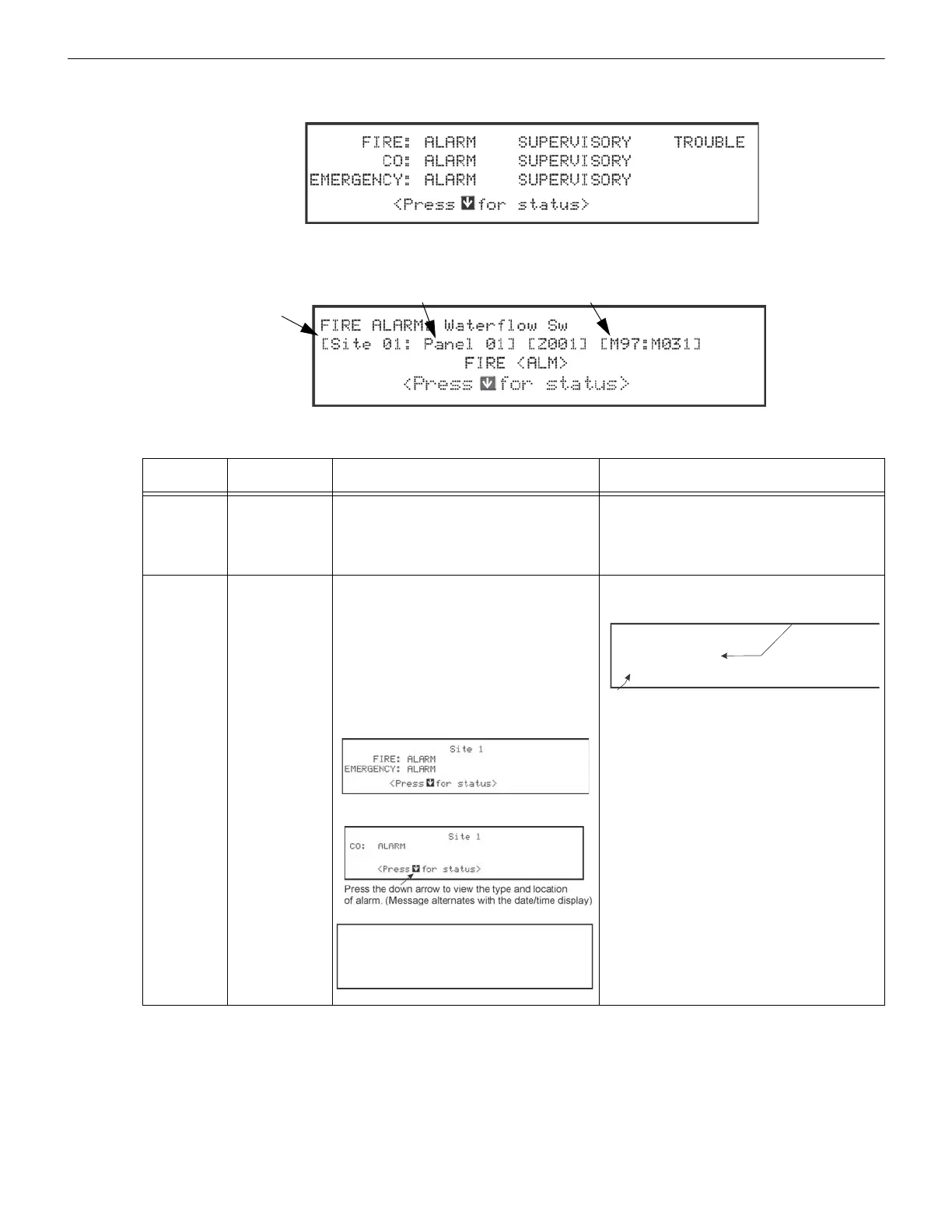 Press the down arrow to view the location and type of alarm supervisory or trouble. If the panel is programmed to Auto Dis-