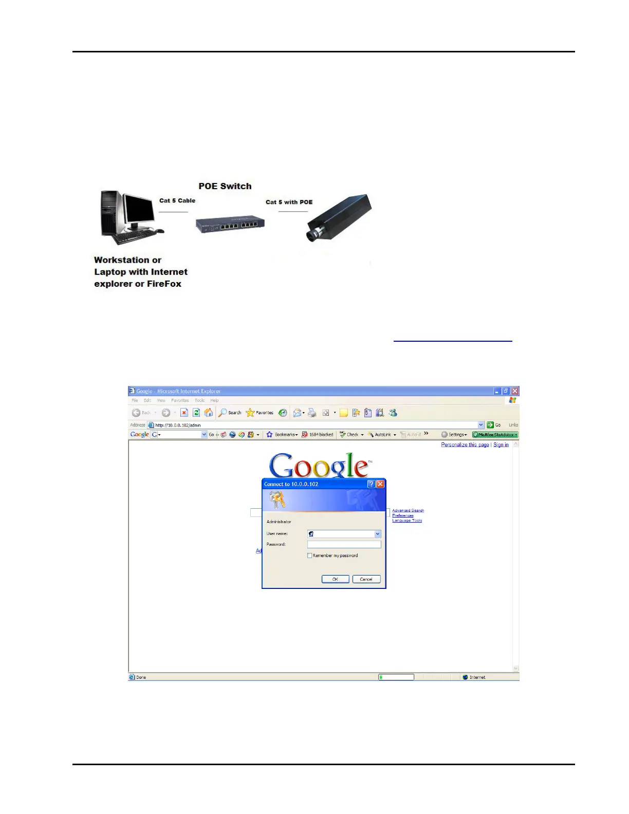 ConnecttheEthernetcabletoahubandattachthelaptoporworkstationusedtoconfigurethecameratothehub.