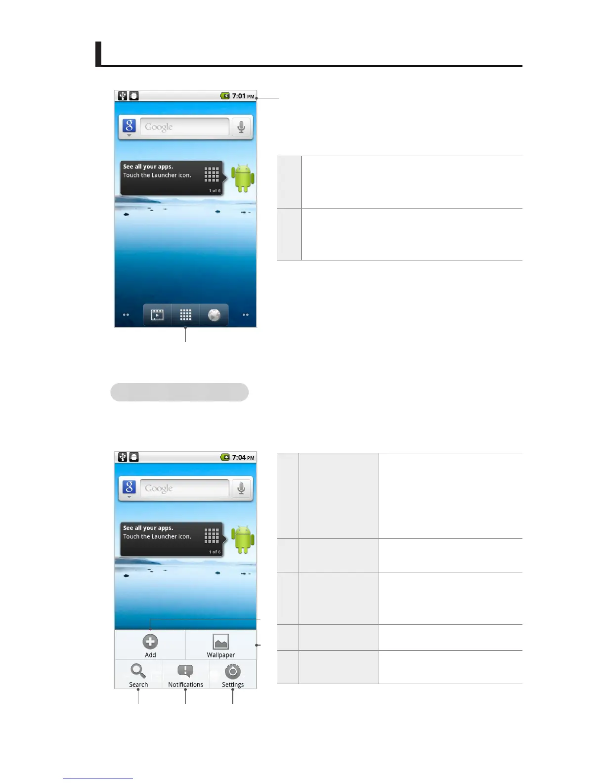 Tap the Menu button on the Home screen or an application screen to use various menu