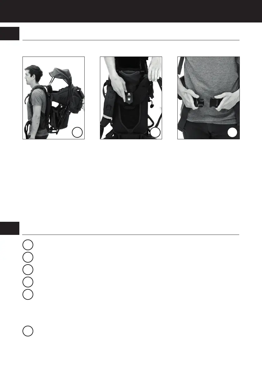 Put the carrier on, then fasten and tighten the hip belt. When tted correctly, the hip belt