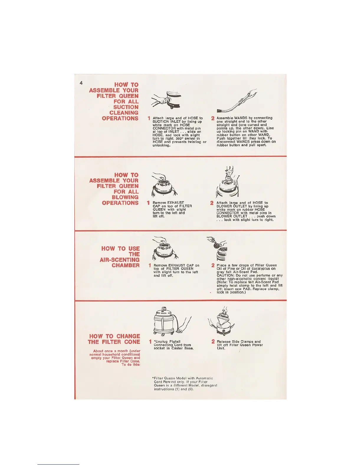 Filter Queen 31X - How to Assemble Your Filter Queen for All Suction Cleaning; How to Assemble Your Filter Queen for All Blowing; How to Use the Air-Scenting Chamber; How to Change the Filter Cone