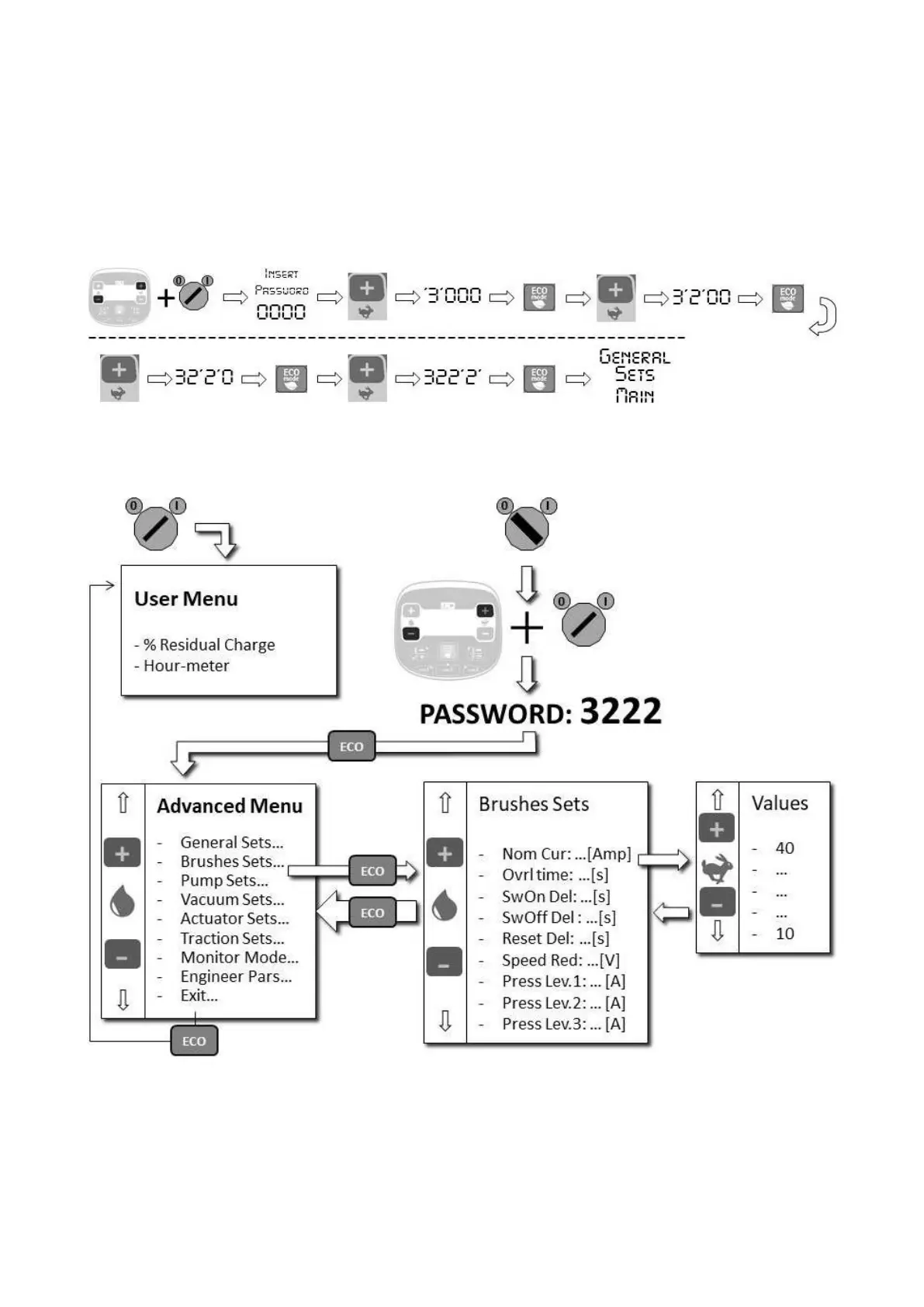 The menu structure can be schematically summarized in the following image. Turn on the machine and access