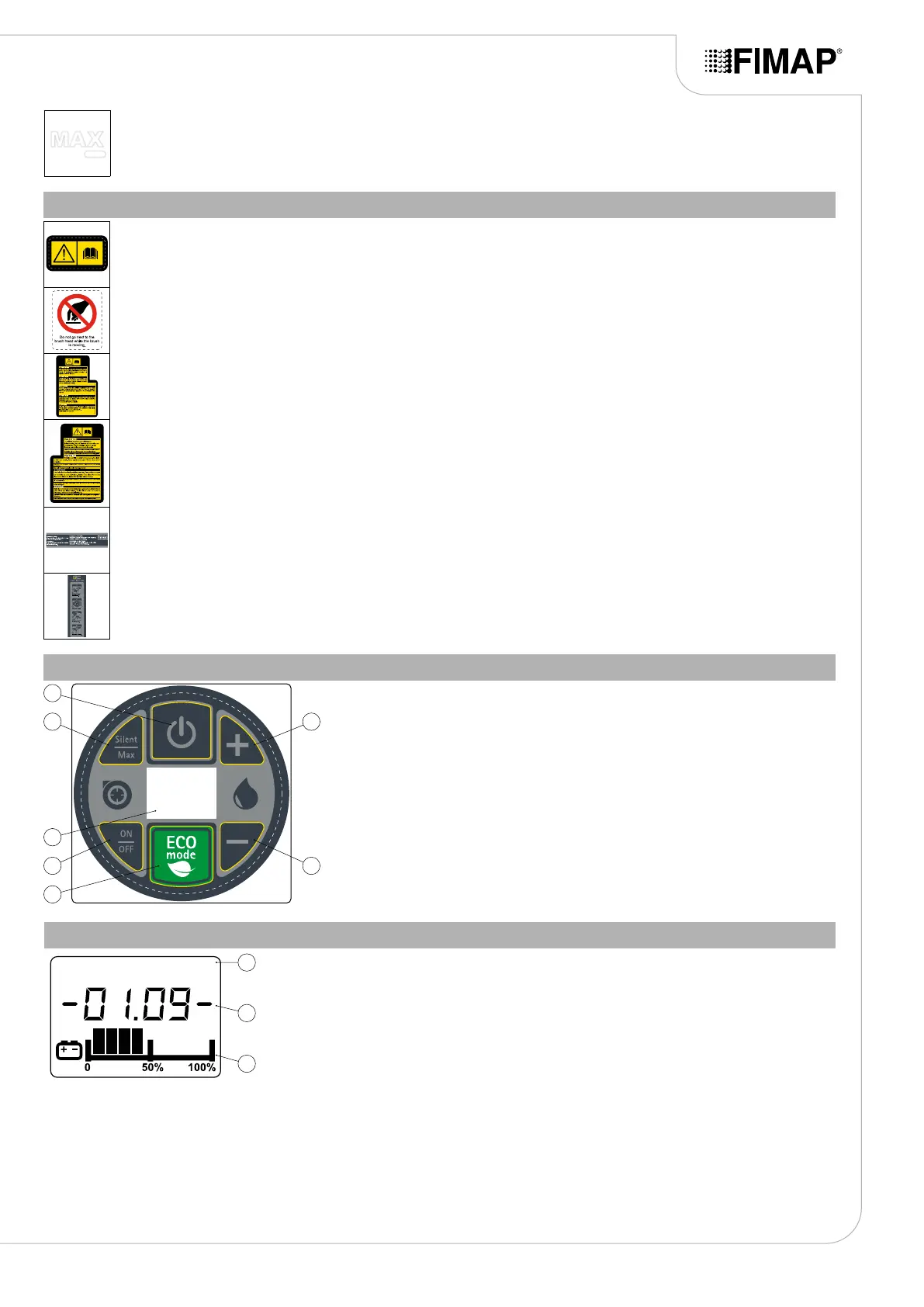 Used on the back of the machine. The label indicates the phases to perform to charge the batteries (valid for versions without CB).