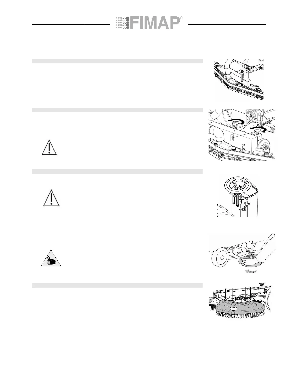 Make sure the parking brake is engaged and that the main switch is OFF. Raise the brush head by turning the