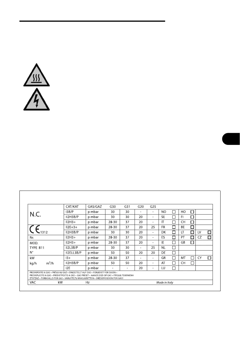 – Plate with gas specifications and country of use abbreviation for "Gas Ovens"