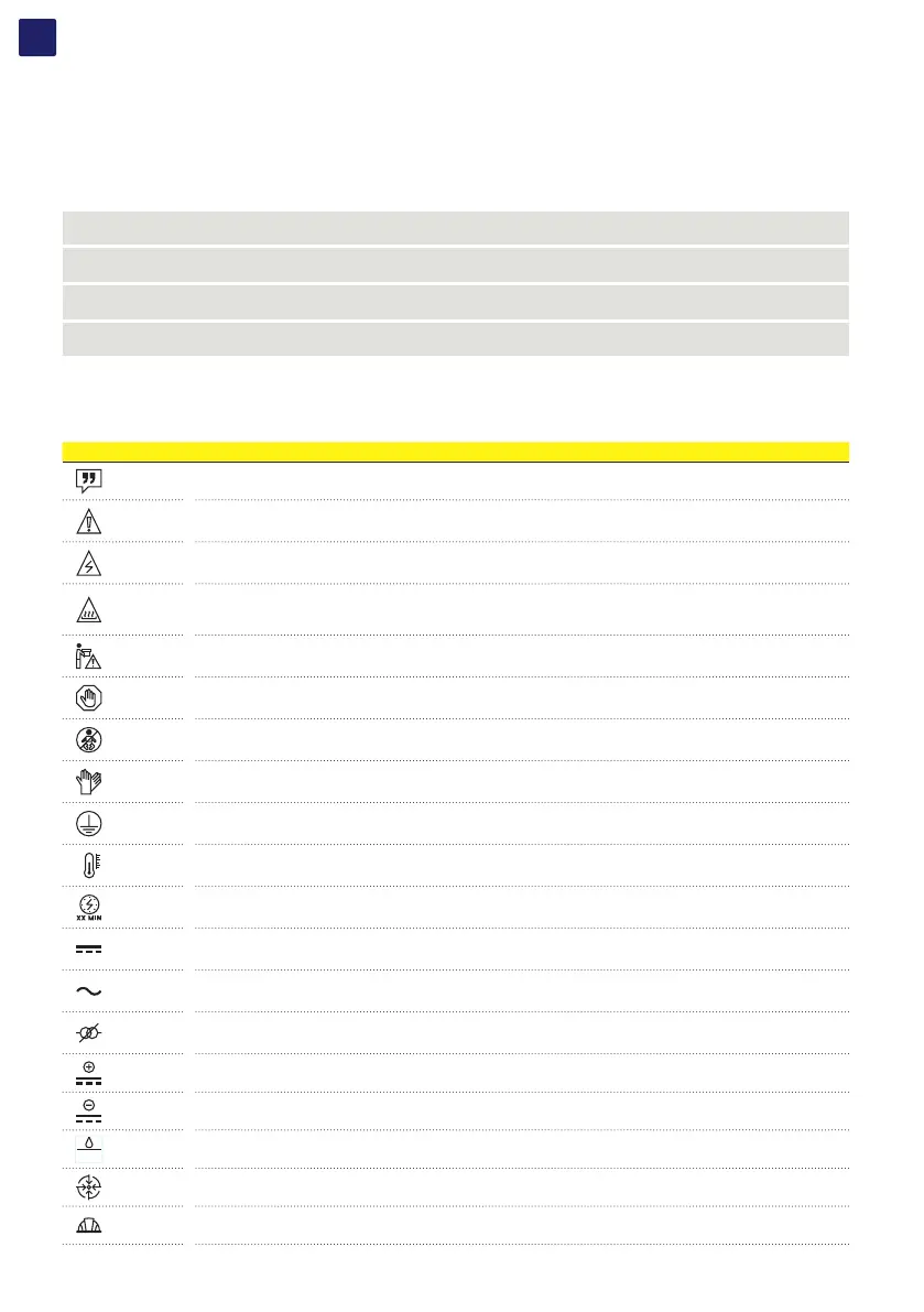 In the manual and/or in some cases on the equipment, the danger or hazard zones/components are indicated with signs, labels, symbols