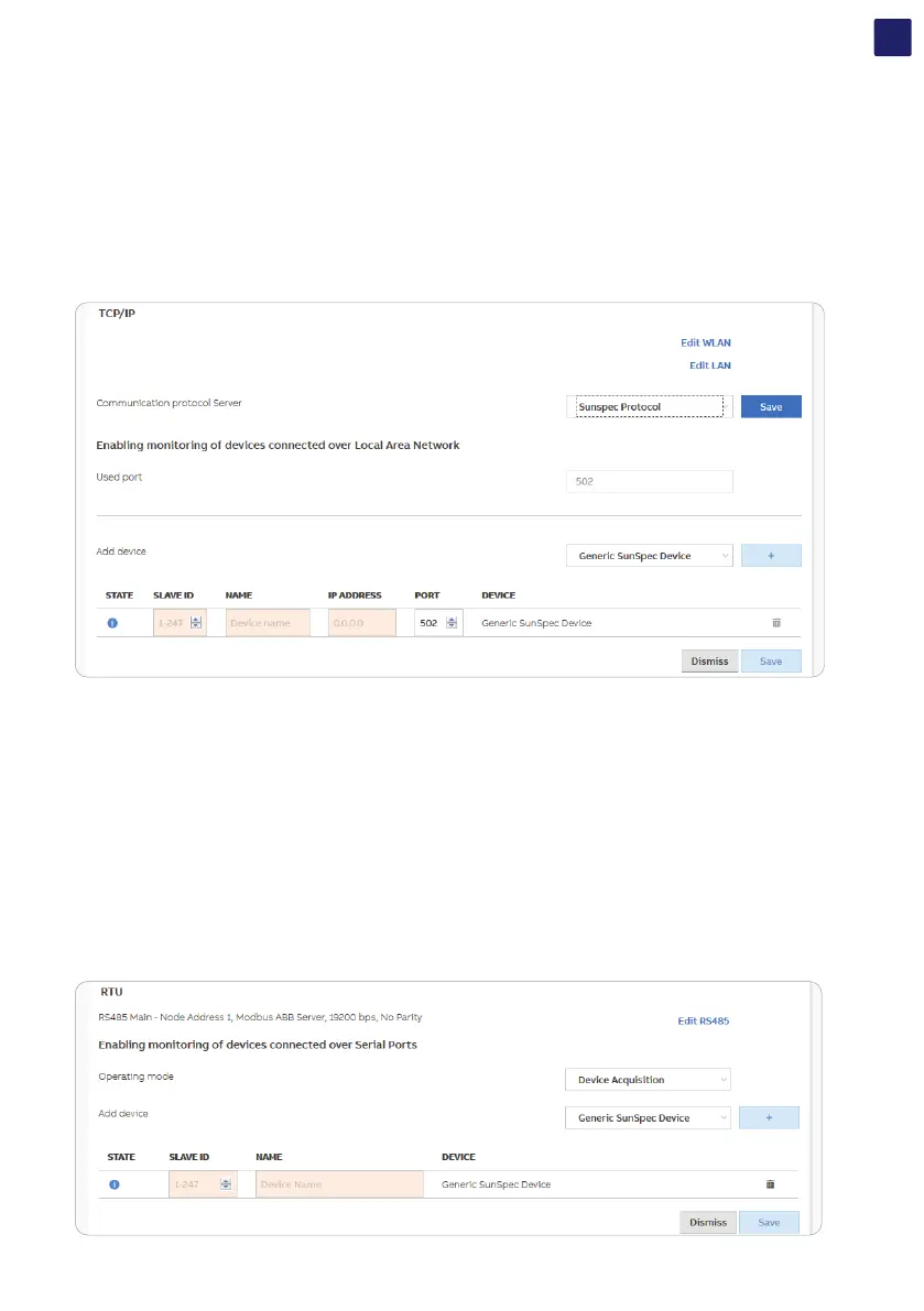wireless channels (“TCP/IP” section) or over RS485 communication line (“RTU” section).