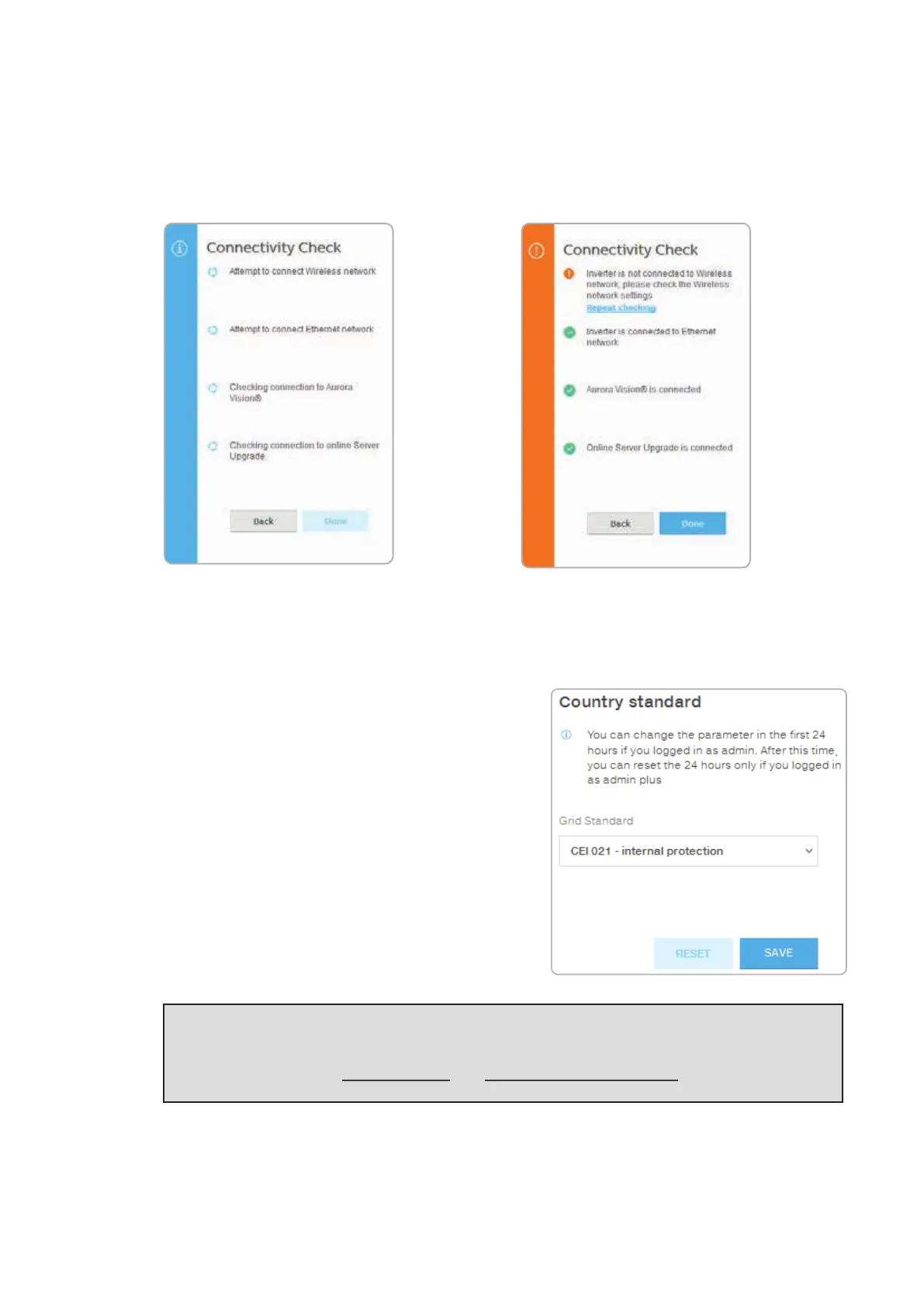 network connection, ethernet connection, connection to Aurora Vision and firmware upgrade servers.