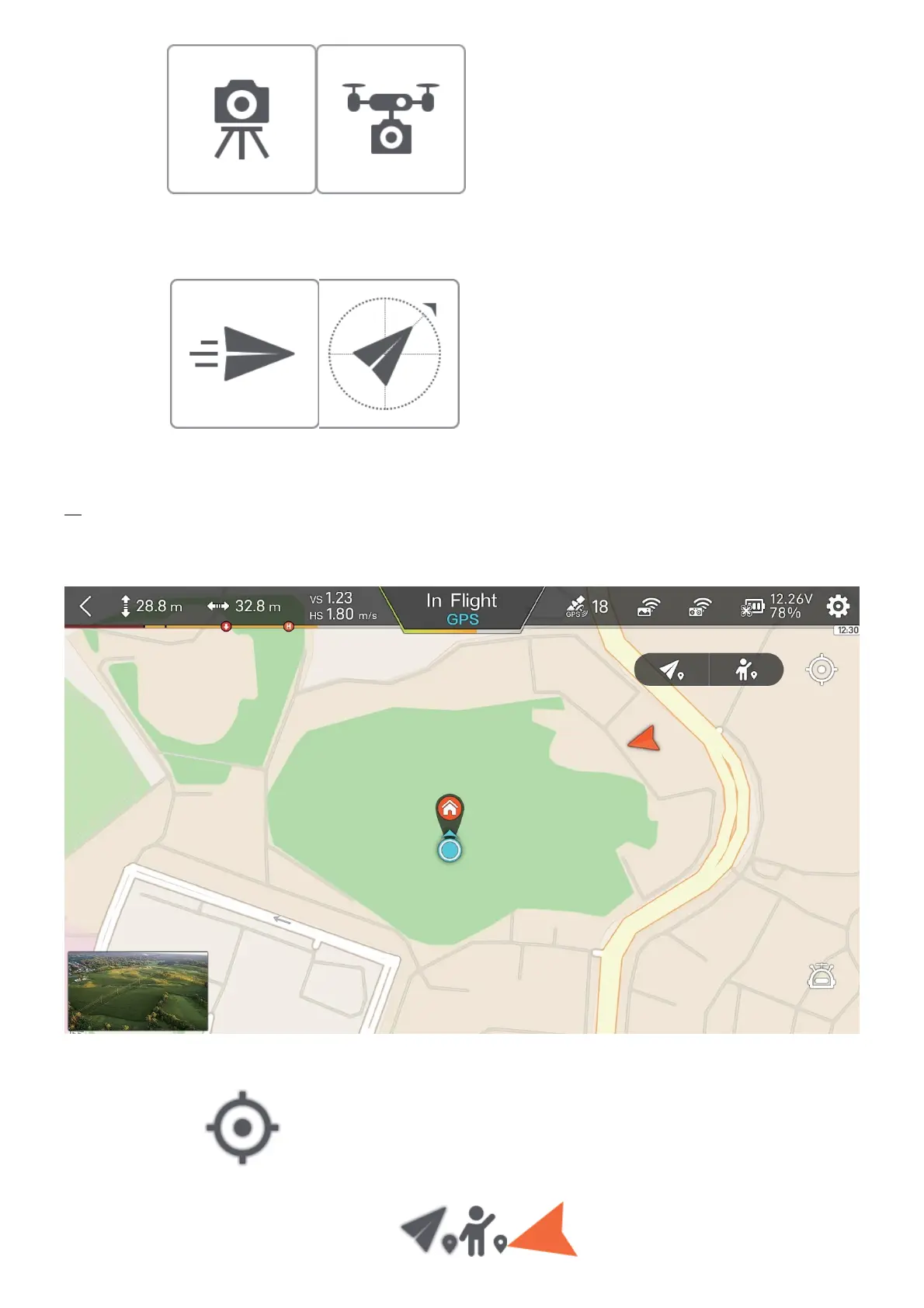 Tap to switch between drone position in the screen center or both drone and phone position in