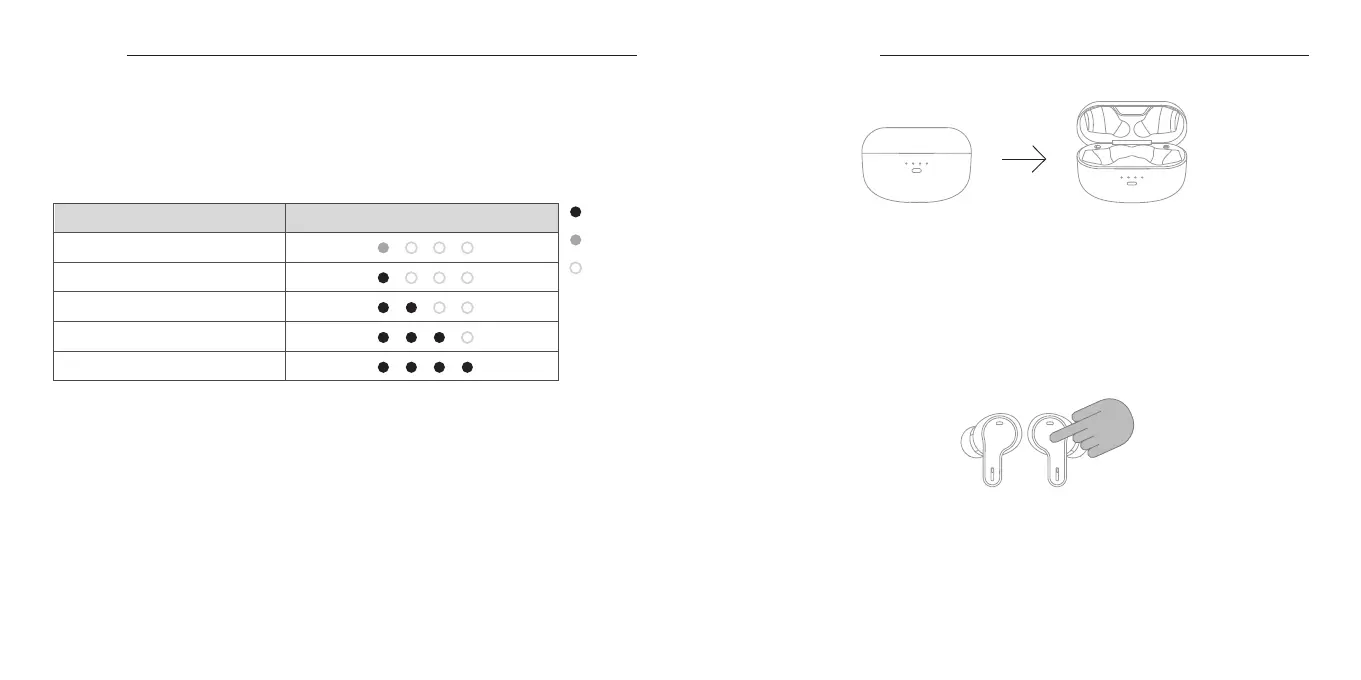 Please refer to the table on page 4 for details on the charging case’ s battery level indication.