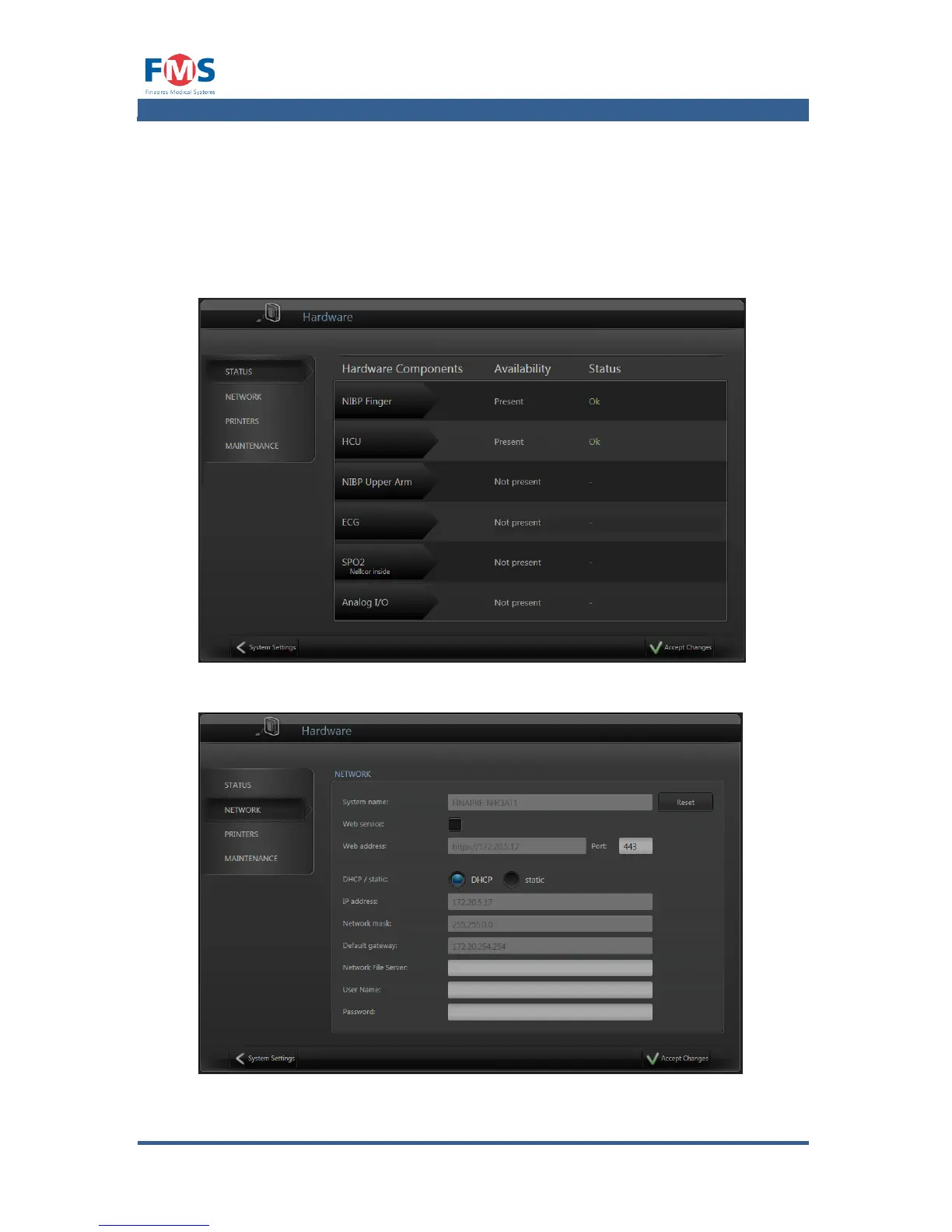 “Maintenance” screen is restricted to Finapres Service personnel.