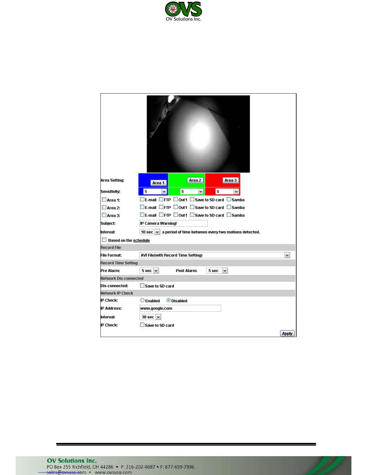 IP CAMERA allows 3 areas motion detection. When motion is triggered,