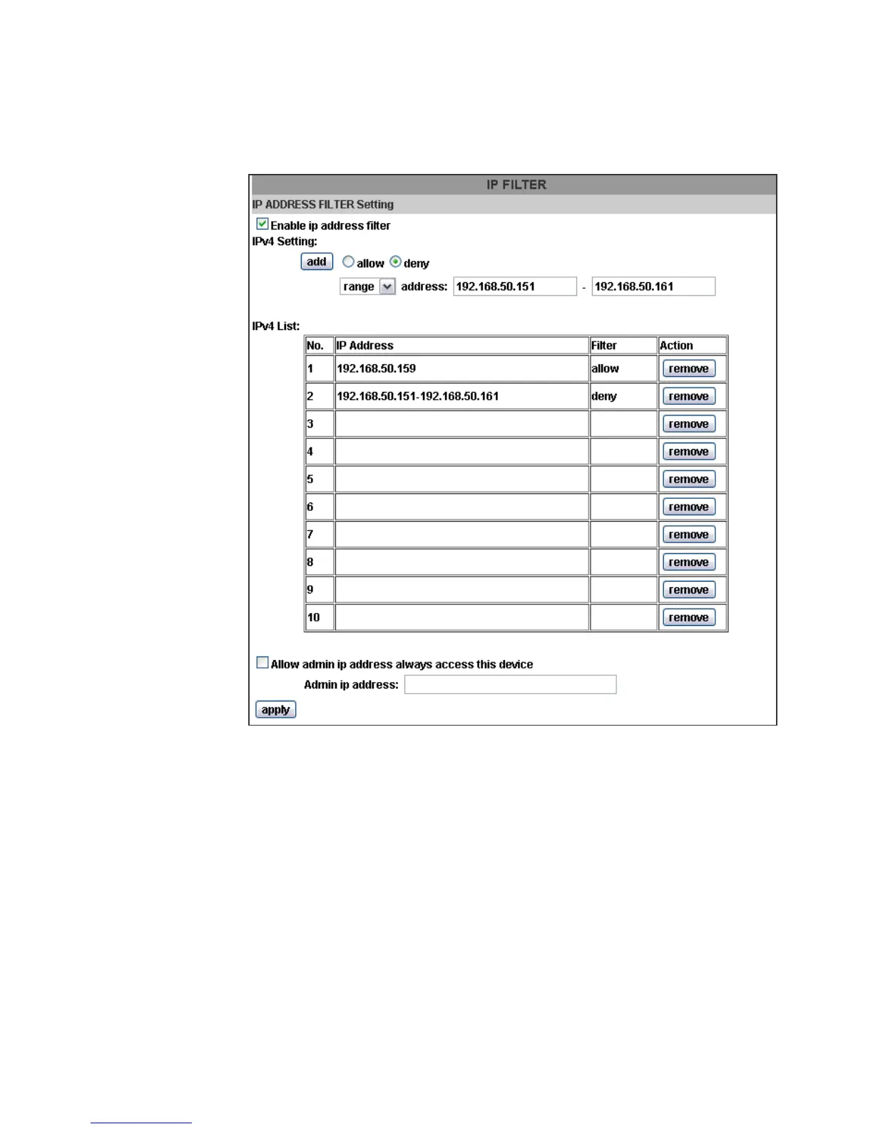 set "Deny: 192.168.50.151~192.168.50.161" for the first item and "Allow: