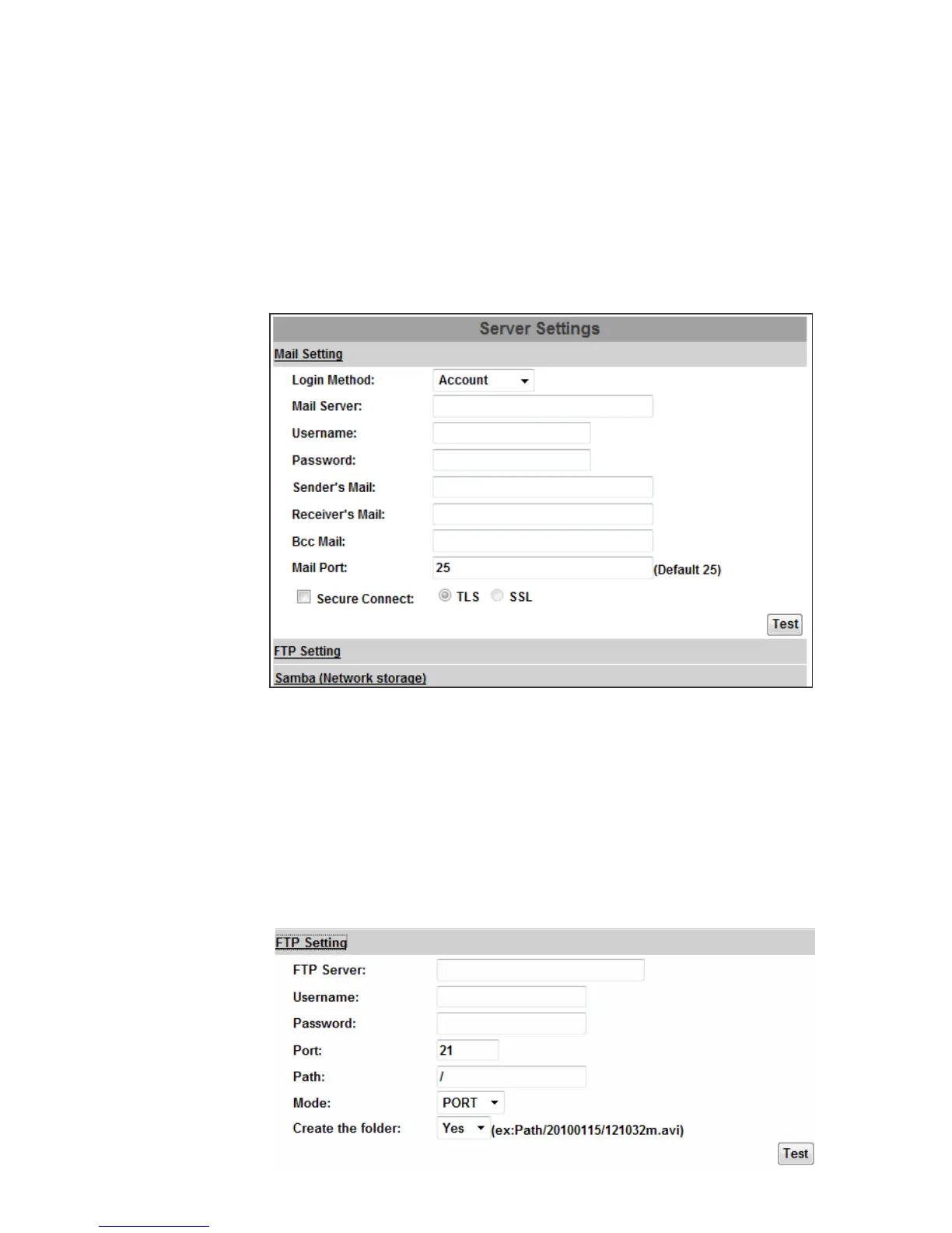 The settings of Email, FTP and SAMBA are used when the event happens,