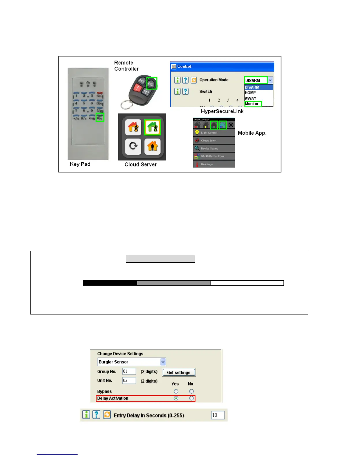 Enter into “DISARM” or “MONITOR” Mode from different devices or services.