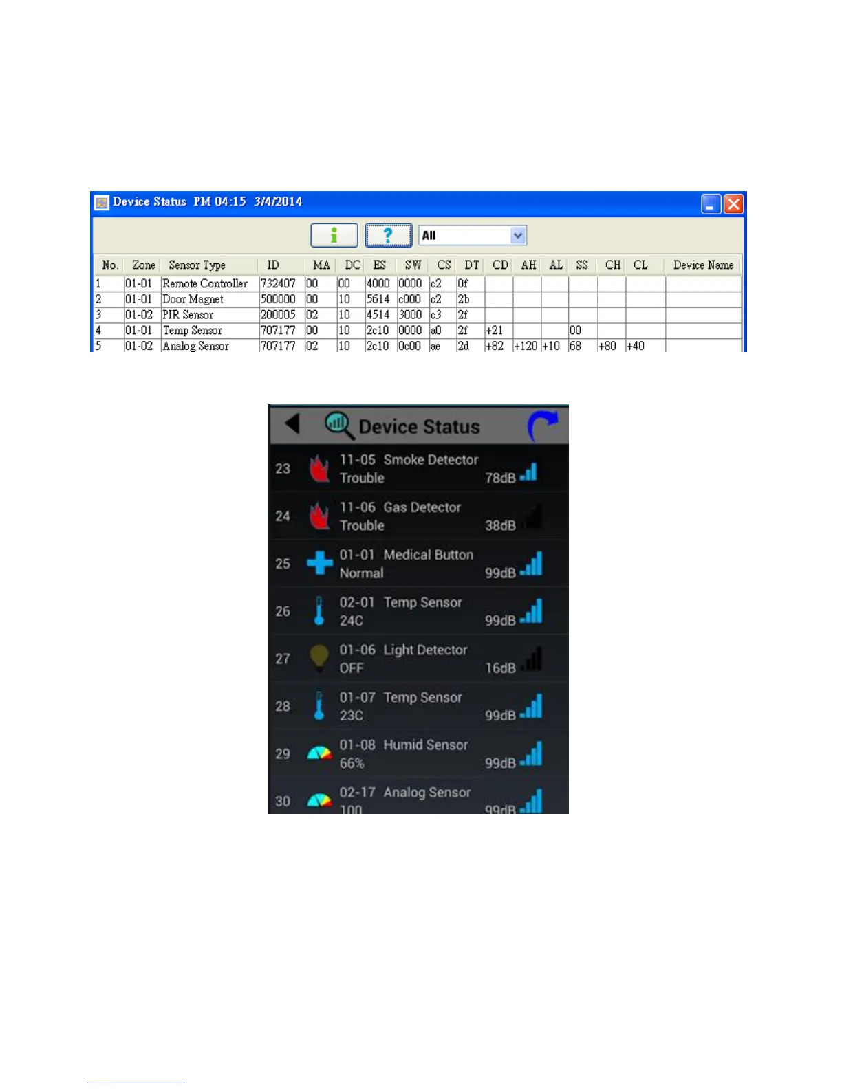6.2 Device Status: The latest state of the sensors including, signal strength and readings can be checked by