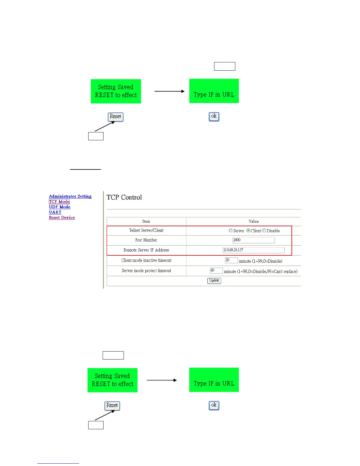 * Select TCP Mode and change the settings according to the information from the web server or CMS