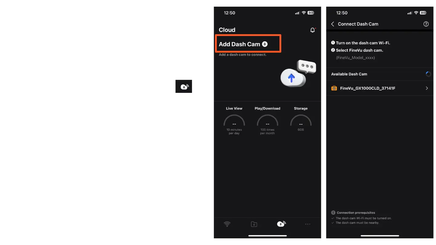 Tap "Add Dash Cam" in the Cloud tab.