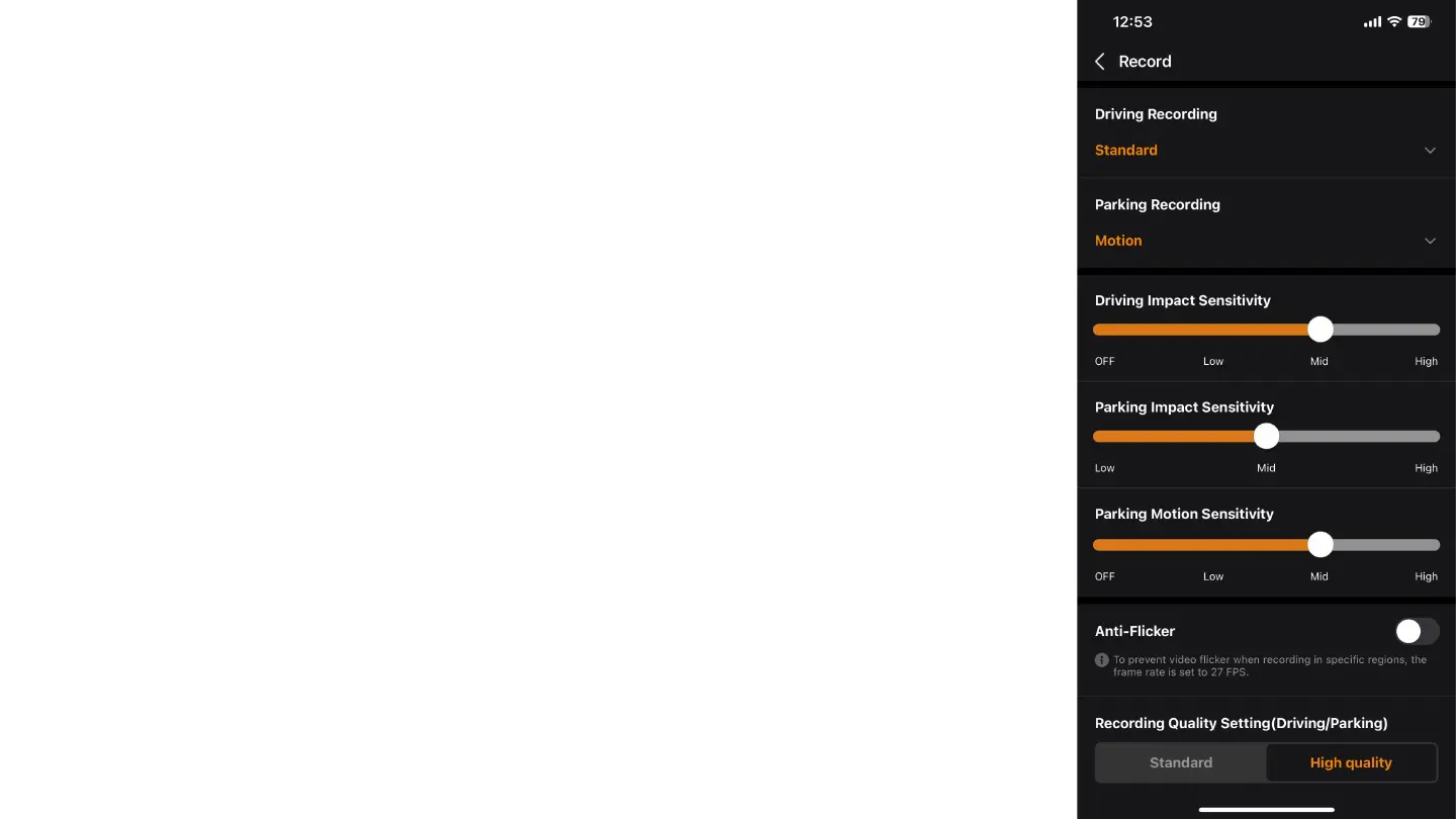 Driving Recording: Choose the recording mode for driving. Options are "Standard" or "High".