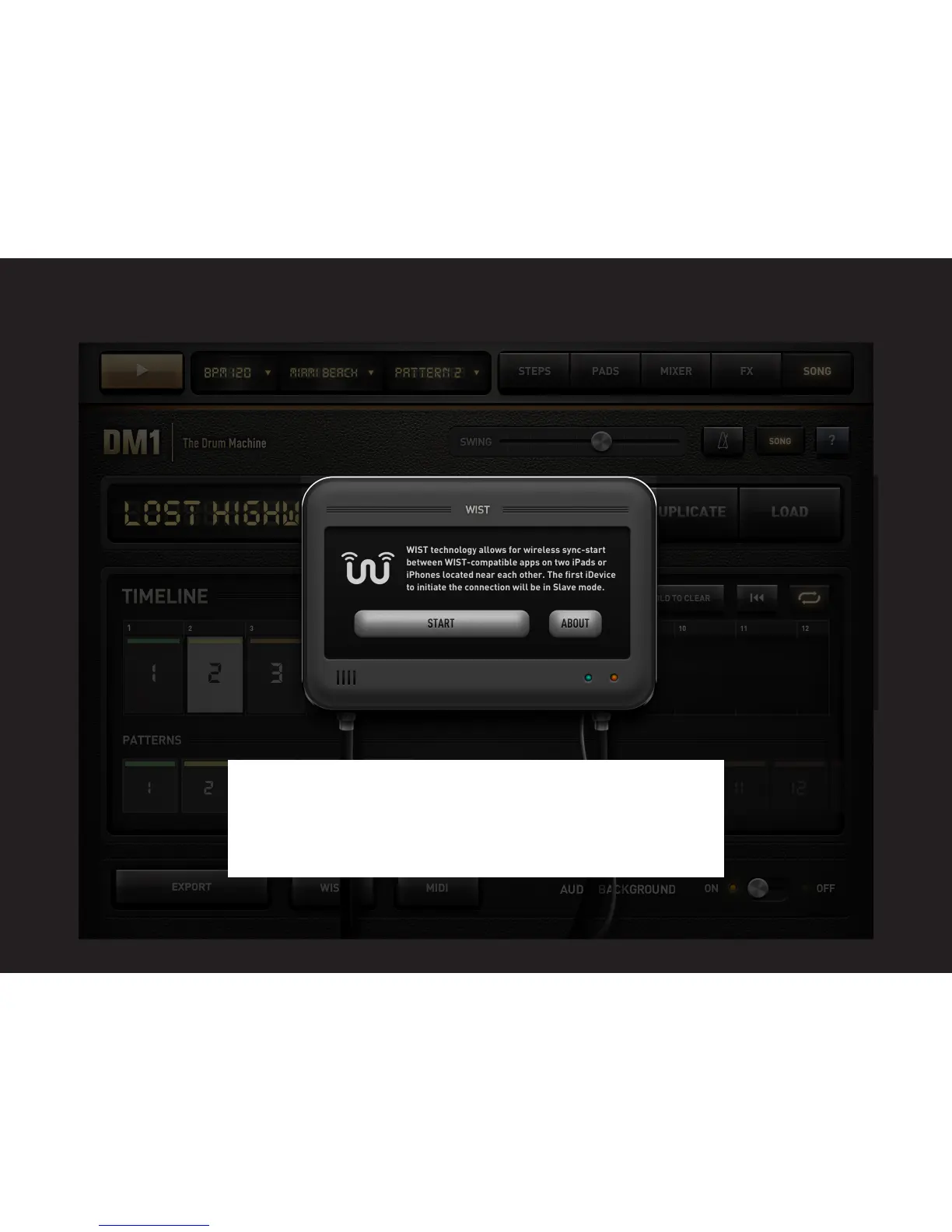 sync-start, sync-stop and tempo. Press START to activate WIST and detect
