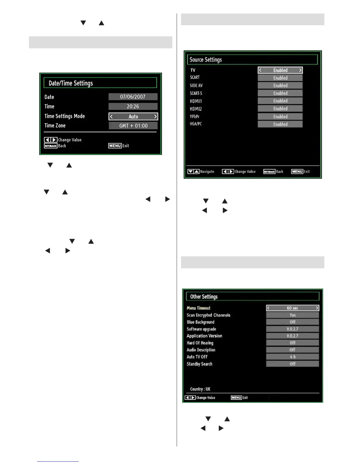 Settings in the Settings menu and press OK button.